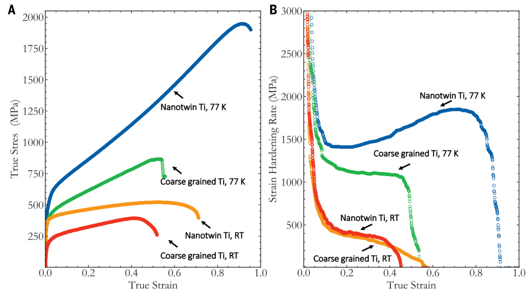 标称应变速率为0.001秒时的真实应力与真实应变曲线以及与其粗晶粒对应物的比较,可以看出纳米孪晶钛显示出比其粗晶对应物更好的机械性能。