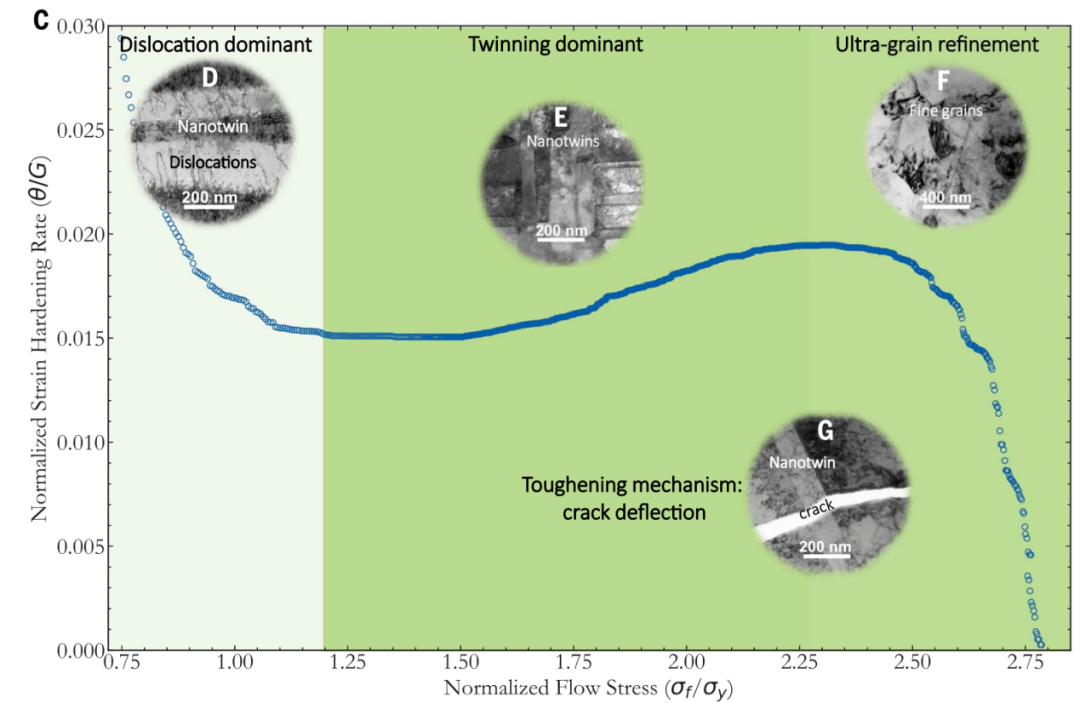 (E 和 F)低温机械过程后(E)纳米孪晶在室温下的图像和(F)在 673 K下原位 TEM 退火1小时后相同区域的图像,显示孪晶结构的稳定性,也显示了其他内部缺陷的应变场的放松。