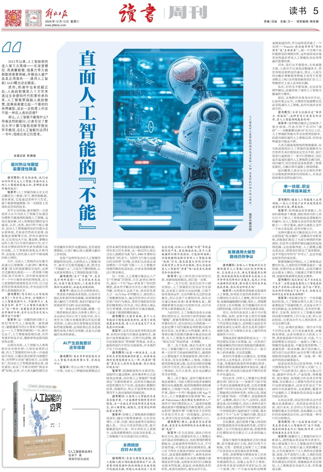 2012年以来,人工智能研究进入第三次高峰——在深度模型、高质量数据、强算力等方面都取得重要突破,并推动大量产品及应用落地……通用人工智能(AGI)曙光近在眼前。然而,热潮中也有质疑泛起:人类的智慧是几十万年来透过生命密码代代积累传承而来,人工智能要超越人类的智慧,脱离场景建立起一个最初的世界模型,这在一定程度上何尝不是一种反人类的思维?那么,人工智能不能做什么?带着这样的疑问,记者专访了复旦大学计算与智能创新学院张军平教授,在《人工智能的边界》一书中,他给出自己的思考。读书周刊:首先想请教,我们该如何科学定义人工智能?目前社会上对人工智能的普遍认知,有哪些需要纠偏的地方?张军平:人工智能的核心定义可以概括为三要素:学习、模型和数据。具体来说,它是通过某种学习方式,基于数据构建模型,在一定程度上完成给定目标的技术。关于认知纠偏,最关键的一点是很多人认为当前人工智能正快速迈向堪称万能通用的超级人工智能,这其实是误解。对人类智能的模仿包含感知、认知、决策、执行四个核心部分,目前人工智能做得较好的部分是认知领域,尤其是自然语言处理、抽象概念理解等方面。然而在感知层面,它还有很大不足,像走路、拿物品这些人类习以为常的感知行为,由于科技在模拟自然界生命传感器方面的局限,人工智能的表现远不够自然,这也是人形机器人动作不够流畅的核心原因。另外,当前人工智能的认知能力是通过巨量数据、大量GPU(图形处理器)算力和深度模型实现的,这种方式能效比极低——一次训练可能消耗20万块显卡,其年耗电量相当于一个中小城市全年的用电量,这与人类智能的高效能完全不同,它只是在特定领域表现突出,并未达到自然界人类智能的水平。读书周刊:您写的《人工智能的边界》一书分为三部分,分别探讨了人工智能能做什么、不能做什么、未来会怎样。其中“人工智能不能做什么”这一部分,目前在社会层面的讨论中相对冷僻,是什么让您决定深入探讨这个话题?张军平:这一话题的探讨源于上世纪70年代人工智能第一波热潮时,德雷福斯写的《计算机不能做什么——人工智能的极限》一书。50年过去了,人工智能虽发展迅速,但仍有诸多明显不足,重新审视这些局限很有必要。从现实来看,人工智能与人类智能存在本质差异:人类有发育的过程,而人工智能的结构大多一开始就设计固定,只能在既定框架内调整任务;自然界生命是“感知优先、认知随后”,但当前人工智能更重视认知、弱化感知,形成了不够合理的“倒金字塔”结构。此外,对人类大脑的模仿还存在硬件和软件双重局限,尤其是伦理限制,让我们难以深入探测大脑的工作机制。现在产业界和社会对人工智能的期望有些过热,大家热议人工智能10年、20年之后能否超越人类。探讨其“不能做什么”,正是为了理性降温,让大家客观看待人工智能的发展节奏。读书周刊:这个“不能”中,是否包含两种类型?一是当前技术未达到,未来可能实现的;二是因本质结构和内涵限制,永远无法做到的。张军平:确实包含这两种情况。一类是技术路线尚未找到,比如对大脑认知机制的彻底破解。如果能搞清楚大脑的工作原理,我们可能就不必依赖高算力GPU来实现智能。另一类是本质性局限,就像一只二维的蚂蚁在莫比乌斯带上爬行,它永远会认为自己当下身处平面,而人类作为三维生命能看清其所处的真实结构。人类认知自身智能也存在类似的维度限制,必须依靠比自身更高维的视角才能完全理解,这是无法超越的本质性缺陷。读书周刊:您在书中将情感列为人工智能不能做的事之首,原因是什么?张军平:可以从两个角度理解。一方面,当前人工智能的发展模式注定其未来的智能表现会越来越像机器,而非真正的生命体。这一情况可以类比当初人类模仿鸟类飞行。1903年莱特兄弟发明飞机至今,飞机的飞行能力远超任何自然界飞行物,但我们从未真正成功模仿一只鸟的飞翔——人工智能对情感的模仿也是如此,后者本身很难通过计算来表达。另一方面,人工智能可能会让人产生“有情感”的错觉。早在20世纪50年代,就有一个叫“Ilize(伊莉莎)”的问答模型,原本用于解决大学生心理方面的问题,结果长久交流下来,该项目负责人之一认为Ilize非常懂自己。现在的人工智能更加强大,通过自然语言对话记忆用户的行为表达,凭借完备的知识体系和概率统计的方式,可以诱导人类认为它有情感,但这显然并非真实情感,只是基于数据的模拟输出。读书周刊:之前有案例,某个人工智能语言模型面临更新时,出现了拒绝被覆盖的表现,有人认为这是它产生自我意识的证据。张军平:这其实还是程序的表达结果,和程序员编写的算法直接相关。算法中没有情感设计,只有代码逻辑,偶尔出现的类似“有情感”的表述,本质上是程序迭代中的优先级体现,并非真的产生了自我意识。读书周刊:还有一种说法是,人类会把自身情感投射到机器上,就像养宠物时觉得宠物爱自己一样,机器的“情感”其实是人类的自我投射。您认同这种观点吗?张军平:机器和宠物有本质区别:宠物可以通过眼神、动作等多种方式直接表达情感,而目前人工智能的“情感表达”主要依赖语言。这种语言输出到底是机器自主产生的,还是统计数据的结果,很难界定,所以不能简单地将其等同于