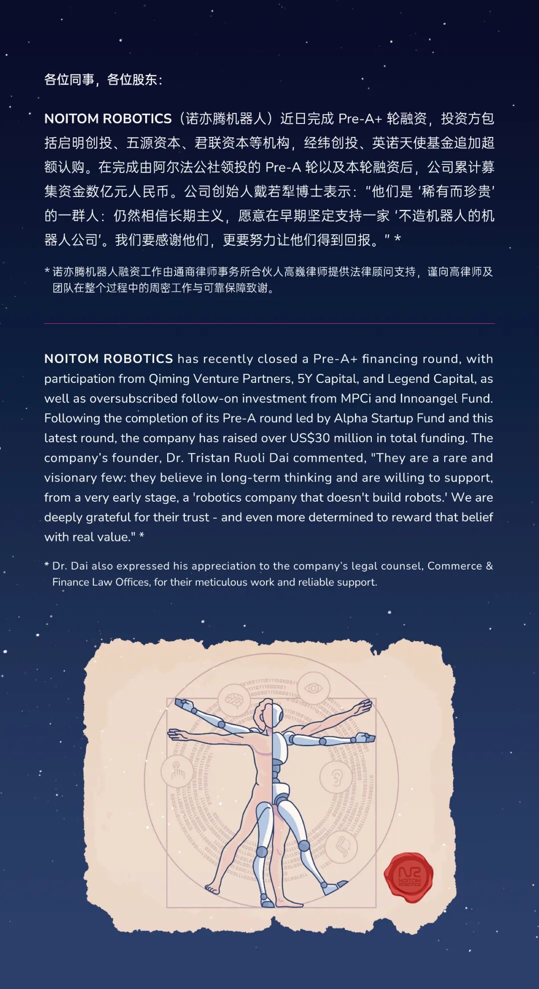具身智能前沿技术研发商诺亦腾机器人完成Pre-A+轮融资,启明创投领投