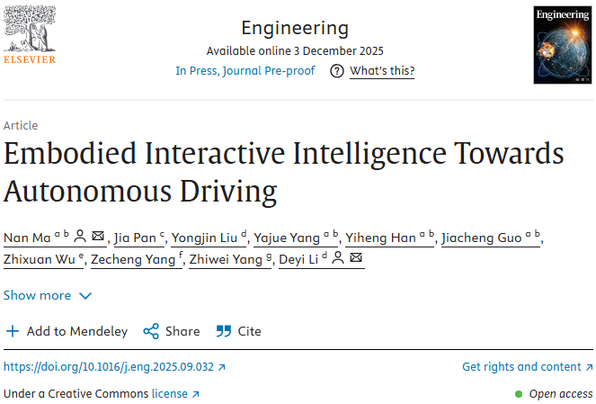 Engineering|李德毅和马楠联合发文——无人驾驶具身交互智能