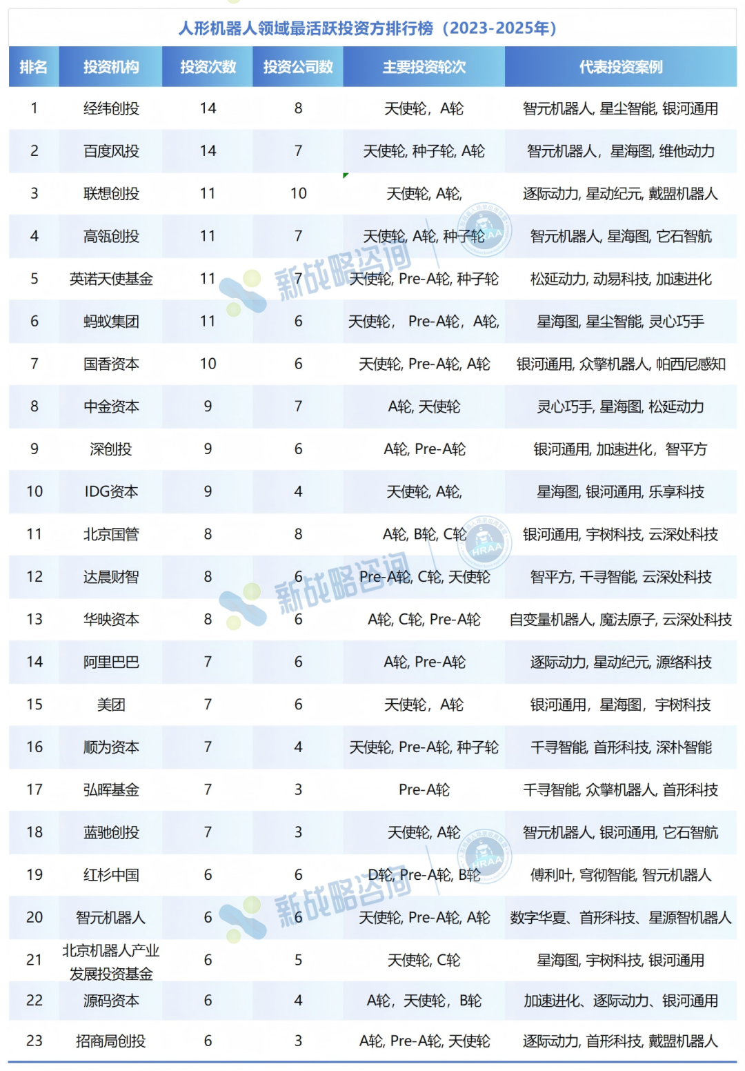 对于新兴产业而言,资本的活跃度往往是最直观、也最真实的行业温度计。 根据人形机器人场景应用联盟统计,截至目前,2025年人形机器人领域累计融资已超过210起,融资总额超540亿元人民币。 若将时间维度拉长至近三年(2023-2025年),融资事件数量已超过300起,融资总额接近700亿元人民币。在人形机器人这一新兴赛道中,资本正以前所未有的密度持续下注。 而在这超300起融资事件中,平均每一轮融资都有4-5家投资机构同时参与。并且,大多数投资机构并非“一次性试水”,而是在三年内多次、持续加码人形机器人领域,形成了稳定的投资轨迹。 基于上述背景,我们对近三年人形机器人融资事件进行了系统盘点,筛选出2023-2025年期间,在人形机器人领域投资次数达到6次及以上的投资机构,并据此形成《人形机器人领域最活跃投资方排行榜》。如下所示: 截至2025年12月22日,根据网络公开信息整理,如有未完善之处请指正 谁最看好人形机器人? 榜单共有23家投资机构入选。从榜单本身来看,人形机器人赛道已经出现了一批高度稳定的“长期投资者”。 经纬创投、百度风投以14次投资并列榜首,是近三年中最为活跃的两家机构;联想创投、高瓴创投、英诺天使基金、蚂蚁集团等机构紧随其后,投资次数均在10次以上。 与此同时,中金资本、北京国管、深创投、北京机器人产业发展投资基金等“国家队”资本,也在榜单中占据重要位置。 从投资轮次来看,榜单中的大多数机构主要集中在天使轮、Pre-A轮和A轮阶段。这一方面说明人形机器人整体仍处于技术与产品形态不断验证的过程中;另一方面,也反映出头部投资机构更愿意在早期就进入赛道,通过多项目布局来捕捉潜在的“长期赢家”。 VC、国资与互联网大厂为何同时进场? 如果将视角扩大到近三年300多起人形机器人融资事件,可以看到一个更清晰的资本结构图景:人形机器人赛道正在形成多类型资本共同参与的格局。 传统VC仍占据主导位置,占比约36%,是推动早期创新和技术探索的核心力量;政府及国资背景基金占比约25%,显示出人形机器人在战略性新兴产业中的重要性;互联网与科技巨头相关资本占比约20%,已成为不可忽视的一支力量;其余则由天使基金、产业资本及外资机构构成。 其中,互联网企业是近年来最值得关注的变化因素。在排名前22的投资机构中,明确出现的互联网相关企业包括:百度(14次)、蚂蚁集团(11次)、阿里巴巴(7次)、美团(7次)。 除了以上这些企业之外,京东(5次以上)、腾讯和字节跳动等互联网大厂也多次押注人形机器人及具身智能产业。 近三年互联网公司投资人形机器人企业一览 这也使得人形机器人赛道,不再只是“硬科技投资”,而逐步演变为平台型资本、产业资本与技术资本交织的竞争场。 哪些人形机器人企业最受资本青睐? 从投资案例的重复出现频率来看,一批人形机器人及相关创企,已经成为资本眼中的“高共识标的”。 在榜单中,智元机器人、银河通用、星海图几乎贯穿多家头部投资机构;此外,宇树科技、云深处科技、逐际动力、星尘智能、灵心巧手等企业,也被不同类型资本多次押注。 这些企业往往具备一些共性特征:技术路线相对清晰,具备工程化与持续迭代能力;不仅获得传统VC支持,也能吸引产业资本或互联网大厂进入;在本体、运动控制、感知、具身智能或系统集成等关键方向具备差异化优势。 与此同时,榜单中还出现了一个值得关注的新现象:部分人形机器人创企,已经开始以“投资者”的身份进入市场。 例如,智元机器人以6次投资上榜;此外,银河通用、星海图等企业,也在积极押注早期项目。这表明,部分头部创企已经不再只是单纯的被投方,而是在尝试通过投资方式提前布局上下游关键技术,构建围绕自身能力展开的产业网络。 这在一定程度上说明,人形机器人赛道已经开始出现“头部公司—生态型公司”的早期雏形,行业正从单点创新走向初步的生态竞争。 结语 从近三年的融资节奏和投资机构结构来看,人形机器人已经从概念验证阶段,逐步进入到资本持续投入、方向不断收敛的发展阶段。榜单中反复出现的投资机构,既包括高频出手的传统VC,也涵盖政府基金与互联网大厂,说明这一赛道正在形成更广泛的资本共识。 与此同时,被多家机构反复下注的头部创企开始显现,部分企业甚至以投资者身份参与行业布局,反映出人形机器人正在从“单点创新”走向生态与体系竞争。整体来看,人形机器人仍处早期,但资本已经提前入场,围绕这一赛道的长期竞争,才刚刚开始。 |