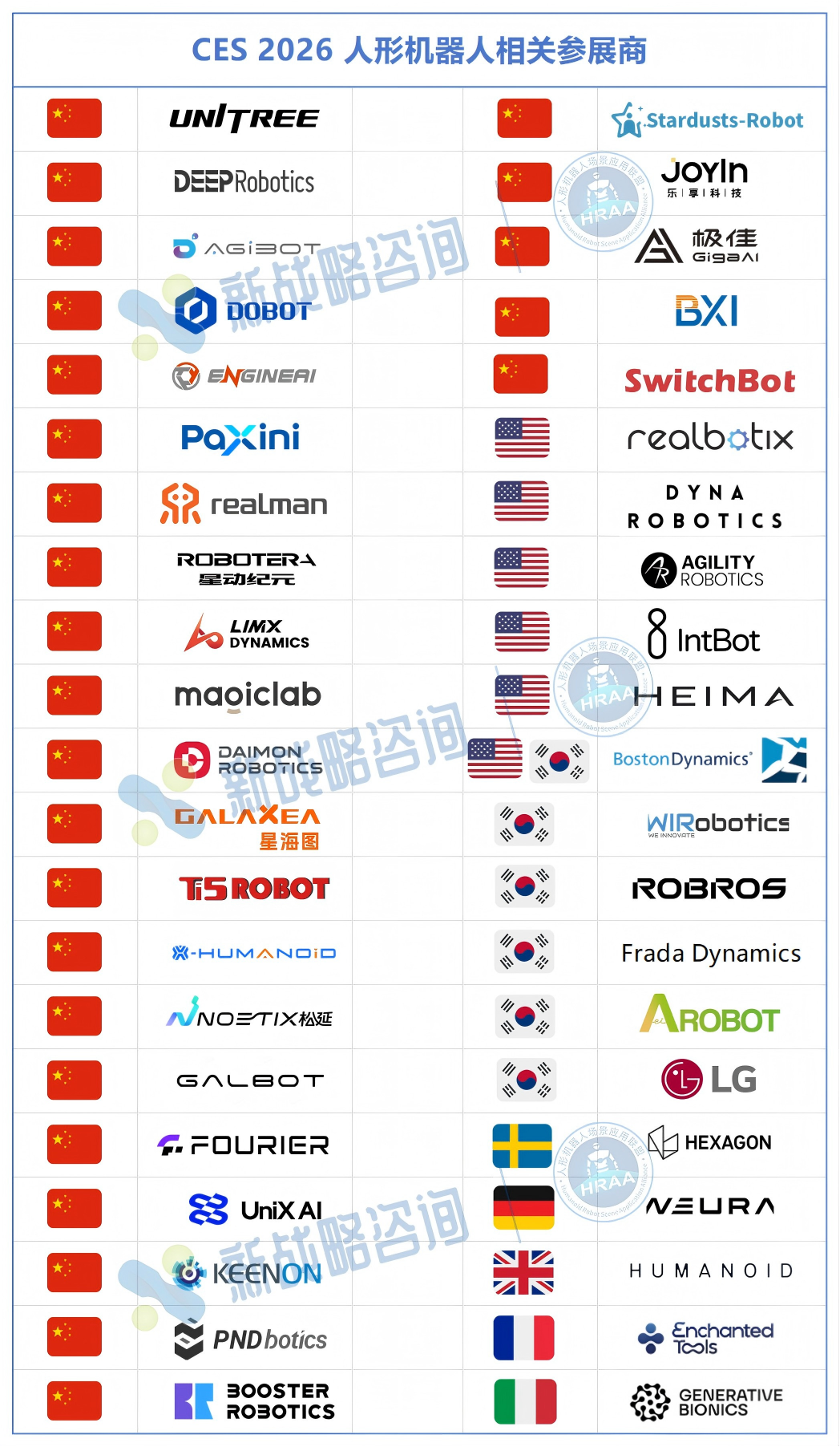 一年一度的国际消费电子展(CES)又来了。作为全球消费电子与前沿技术的风向标,CES 往往最先呈现出下一阶段技术竞争的重心变化。 CES 官方数据显示,本届展会中与机器人相关的参展商共有 598 家,其中来自中国的企业达到149家,占比接近四分之一。在人形机器人这一最受关注的细分领域,官方统计的38家参展商中,有21家来自中国,占比超过一半。但从实际情况来看,今年展出人形机器人的相关企业可能还要更多。以下是我们的简单盘点: 中国:从“产品集中亮相”到“系统级输出” 在 CES 2026 的人形机器人展区,中国企业的存在感几乎无法忽视。不同于早年零散、单点的技术展示,今年中国厂商呈现出的,是一条从整机、本体运动控制,到感知、灵巧手、系统平台的完整产业链结构。 宇树科技无疑是最具“量产信号”的参展者之一。本届 CES 上,宇树重点展示G1 人形机器人的量产版本。与此同时,宇树还展出了新一代全尺寸人形机器人 H2,在运动性能和动态表现上明显增强。 云深处科技在 CES 2026 上则继续走其一贯的工程导向路线。其核心展品包括 绝影系列升级版 X30 与轮足机器人M20 Pro,轮足式结构在复杂工业地形中的平衡能力成为展示重点。 智元机器人则在 CES 2026 上完成了全系列产品的北美首秀。展台集中展示了 灵犀 X2(偏仿生交互)、远征 A2(面向商用服务)以及 精灵 G2(家庭与科研场景)等多种形态的人形与类人机器人。 越疆机器人正式发布Rover X1,其首款智能四足机器人,定位为消费级产品,主打家庭陪伴与智能管家功能,强调从实验室技术走向日常生活场景。除Rover X1 之外,越疆还展示了其人形机器人和协作机械臂在具身智能场景中的应用。 众擎机器人带来的 T800 全尺寸通用人形机器人,是 CES 2026 上中国人形机器人中最受关注的新品之一。T800 整体体态比例高度接近成年人,强调动态稳定性与工程可靠性。 帕西尼感知带来了 TORA-ONE 第二代多维触觉人形机器人,该机器人拥有 47 个自由度。同时,其 DexH13 GEN2 灵巧手成为一大亮点,作为行业首款融合“多维触觉 + AI 视觉”的灵巧手,单个指尖集成了近千个触觉传感器。 睿尔曼智能在 CES 2026 上则从应用层切入,展示RXL 系列仿人形机械臂。同时,其复合升降机器人展示了机械臂与移动底盘在酒店、医院等场景下的物料配送能力,强调系统集成与场景落地。 星动纪元带来了其旗舰人形机器人 星动 L7 与 星动 Q5,重点展示双足稳定行走与全身协调控制的最新进展。 此外,逐际动力、魔法原子、戴盟机器人、星海图、钛虎机器人、北京人形等企业,也在 CES 2026 上展示了各自的人形机器人原型或核心技术模块。 松延动力、银河通用、傅利叶智能、优理奇、擎朗智能、柏奥尼克、加速进化、半醒机器人、杭州星尘机器人、乐享科技、极佳视界等企业,则共同构成了中国人形机器人产业更广阔的“技术与应用后备军”。 整体来看,中国企业在 CES 2026 上呈现出的已不再是零散的技术突破,而是从整机、本体运动、灵巧操作、感知系统到控制平台的完整拼图。这使得中国在人形机器人全球竞争中,首次在“规模化与商业化可行性”层面占据了显著位置。 美国的“平台化”、韩国的“产业化”、欧洲的“场景化” 与中国企业形成鲜明对照的,是国外厂商在 CES 2026 上呈现出的不同发展重点。 今年最受关注的无疑是由波士顿动力与现代汽车集团联合展示的 Atlas 人形机器人。Atlas 在 CES 现场进行了真实动作演示,其流畅的步态、协调的肢体控制,标志着这一经典人形机器人正从实验室阶段迈向工业级应用。现代汽车集团明确表示,未来 Atlas 将在其位于美国佐治亚州的工厂进行试点运行,并计划2028年进厂造车,年产3万台。 除 Atlas之外,北美企业在人形机器人上的另一大特征,是对 AI 平台和系统能力的强调。无论是与大模型的结合,还是围绕机器人构建可持续学习和升级的体系,美国公司更关注“机器人作为通用计算平台”的长期形态,而不仅是单一硬件产品。 英伟达发布了一系列新的机器人基础模型、仿真工具和边缘硬件 韩国在 CES 2026 上则表现出极强的产业野心。本届 CES,韩国企业以 K-Humanoid Alliance(韩国人形机器人联盟) 的形式集中亮相。该联盟由 40 多家科研机构与企业组成,包括 KAIST、首尔大学、POSTECH、Rainbow Robotics,以及 LG、斗山、HD Hyundai Robotics 等成员,集中展示韩国在人形机器人本体、控制系统与应用探索方面的整体进展。 其中,LG 电子在展会上推出了 CLOiD 智能家居助手机器人,明确将人形或类人机器人引入家庭生活场景。CLOiD 配备双机械臂和五指手,展示了家务辅助、物品递送等能力,并与 LG 自身的智能家居生态深度结合。 欧洲方面,CES 2026 出现了多家以工业应用为导向的人形机器人企业。 德国 NEURA Robotics 在展会期间发布了其人形机器人 4NE1,并在展位上展示了该平台在感知、安全协作与自主控制方面的设计思路。 来自英国的 Humanoid 公司则带来了其 HMND 01 Alpha 人形机器人原型机。该产品定位明确,面向工业应用场景,重点展示结构设计、平衡能力以及模块化机械系统,整体展示偏向工程原型而非消费级形态。 总部位于瑞典的工业软件与测量公司 Hexagon 的人形机器人项目 AEON 也是以工业环境中的应用为核心方向。 此外,全球知名半导体公司AMD 和意大利初创企业 Generative Bionics 在CES共同发布了