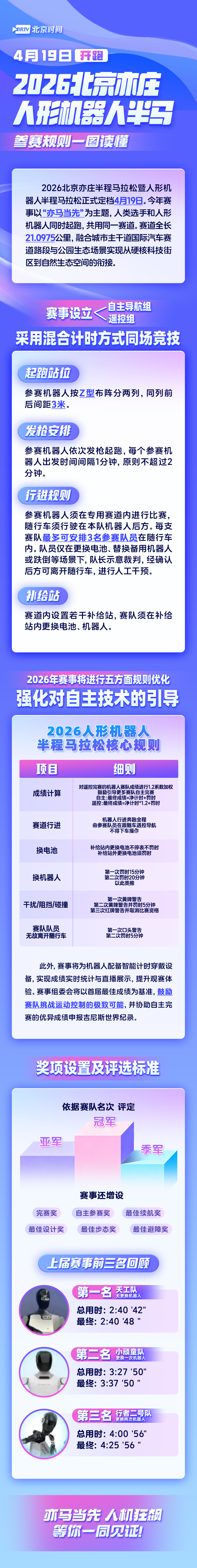 2026北京亦庄半程马拉松暨人形机器人半程马拉松正式定档今年4月19日。赛事创新 “人机共跑” 模式,人类与机器人共用 21公里赛道。机器人分自主导航、遥控组竞技,赛事配全链条技术支持与专项奖项,是科技与体育融合的创新盛宴。