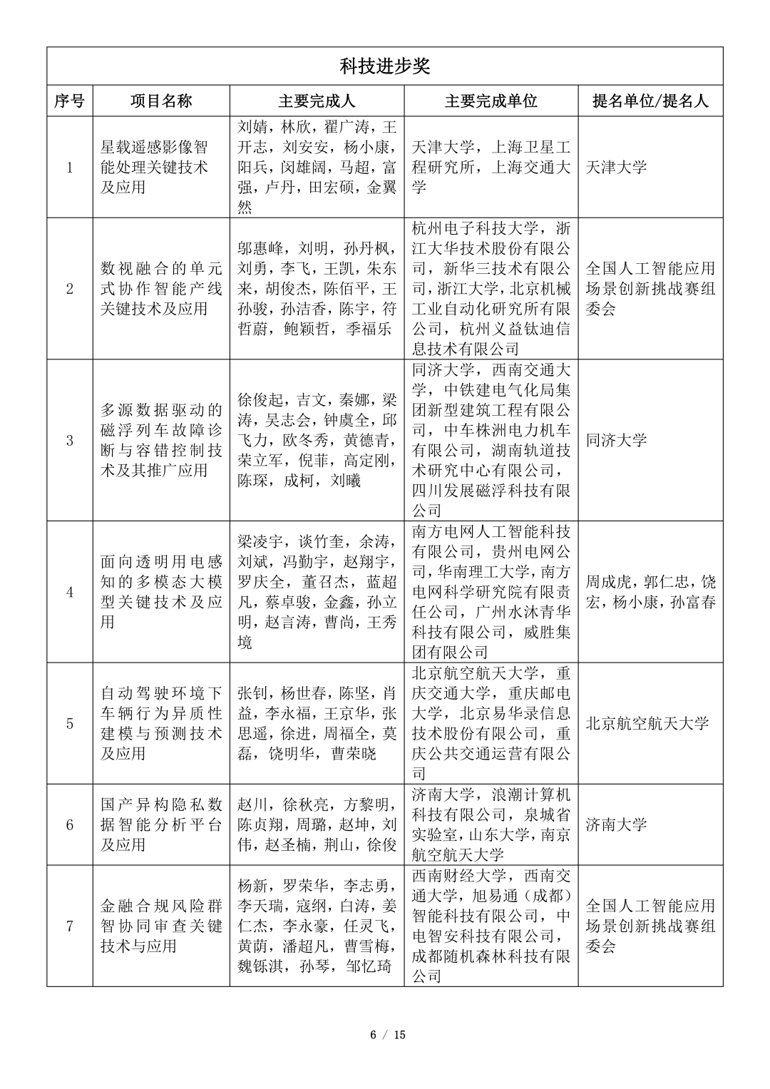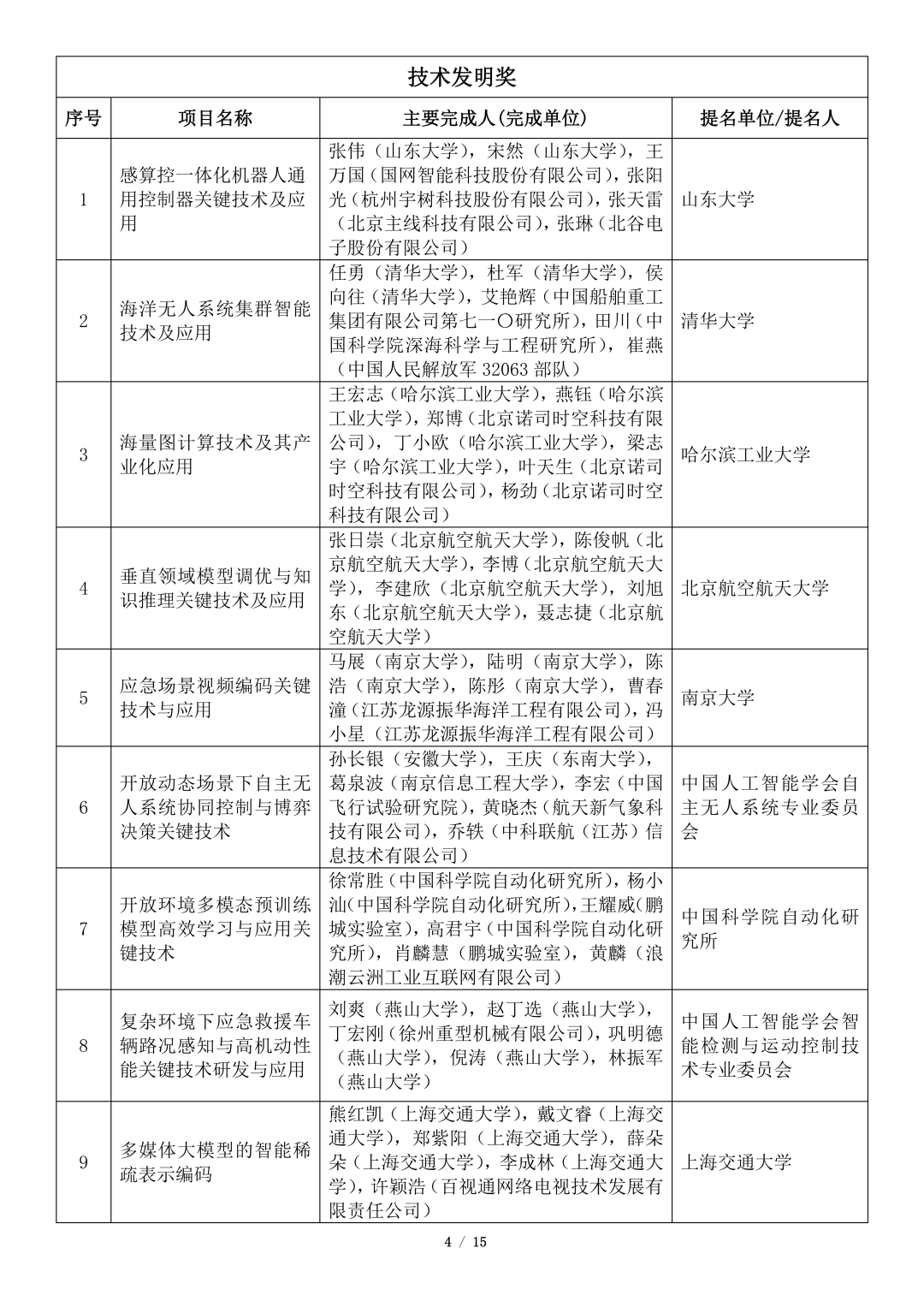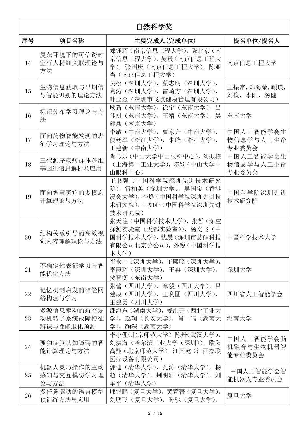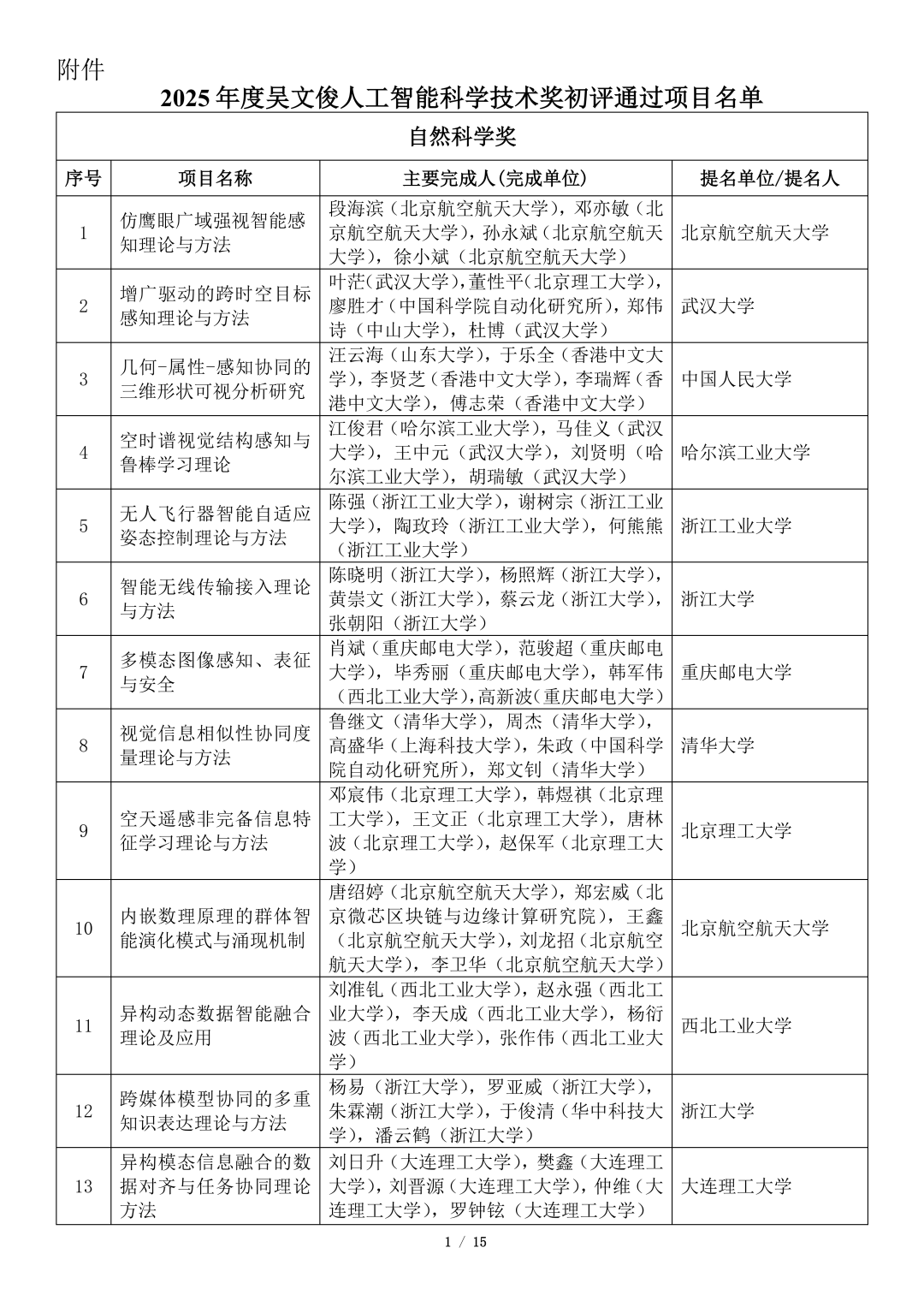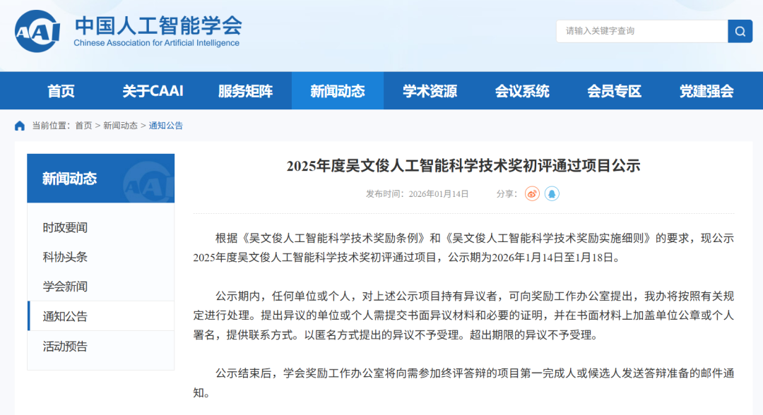 吴文俊人工智能科学技术奖初评项目公示