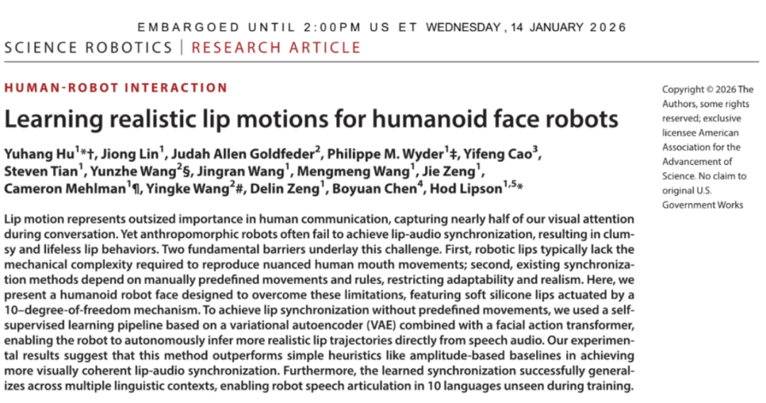 人类面对面交流中,近50%的注意力集中于对方唇部。心理学中的“恐怖谷”理论指出,当非人类实体与人类极度相似却又存在细微的不自然时(如僵硬的面部动作),会引发观察者本能的厌恶与不适。因此,即便是最先进的人形机器人,其“说话”时的表情也常如木偶般呆板,成为人机深度情感交互的关键障碍。 2026年1月,《科学机器人》发布题为“Learning realistic lip motions for humanoid face robots”(为类人面部机器人学习逼真的嘴唇运动)论文。该研究由哥伦比亚大学机械工程系博士胡宇航带领团队,通过创新的“视觉—动作”自监督学习框架VAE-FAT,使仿生面部机器人首次实现了与人类语音、歌曲高度逼真、跨语言泛化的实时唇部同步运动,为填平人机交互中的“恐怖谷”效应提供了关键技术路径。 论文地址:https://www.science.org/doi/10.1126/scirobotics.adx3017 从“对镜学习”到“声音驱动” 研究团队首先设计并制造了高度仿生的机器人面部硬件。其表层覆盖柔性硅胶皮肤,内部隐藏着26个微型电机,可独立且协同地驱动嘴唇、下颌、脸颊等部位。该机械系统能够形成覆盖24个辅音和16个元音的精细口型,为逼真表达奠定了物理基础。 机器人唇形硬件结构。(A)面部机器人设计概览,重点展示了人机交互关键组件:包括扬声器、麦克风、高清摄像模块,以及用于固定柔软硅胶面皮的磁吸式快拆连接器。该连接器能实现面皮的精准定位,并通过推拉双向运动驱动硅胶面皮,完成说话时所需的复杂唇部动作。(B)搭载柔软硅胶面皮的人形机器人外观展示。其底座内部集成有边缘计算设备。(C)唇部驱动系统特写,展示上唇、下唇与唇角连接器分别对应固定于相应唇部支架。柔软可替换的面皮通过磁吸连接器固定,可便捷拆卸以进行维护或个性化调整。 该研究的核心创新在于软件与算法,即变分自编码器与面部动作变换器的结合模型。 第一阶段:自我建模。机器人被置于镜前,通过随机运动电机并观察镜中自身面部形态的变化,构建初始的Facial Action Transformer (FAT)模型。这个过程类似于婴儿通过镜像认识自我,是机器人建立对自身物理结构认知的自监督学习。 机器人能实现的口型及其对应音标展示。该机器人展示了再现关键英语音标的能力,例如爆破音(/p/ 和 /b/)、双唇音(/m/)以及圆唇元音(/u/ 和 /o/)。通过独立控制上唇、下唇及嘴角,每帧图像均捕捉到其实现的典型唇部运动效果。这些数据为机器人在说话时实现正确的唇形匹配奠定了基础。 第二阶段:音视频关联学习。机器人并非直接观看海量人类视频(以避免人类与机器人面部机械结构的巨大差异),而是通过Wav2Lip技术生成的、与机器人面部结构一致的“合成视频”进行学习。这些视频的语音内容由TTS(文本转语音)和ChatGPT生成,提供了声音与“理想”唇部动作的配对数据。一个变分自编码器被用于将合成与真实的机器人面部视频帧编码到一个共享的潜在向量空间中,提取出与唇部运动最相关的关键视觉特征。 机器人唇形同步的自监督学习框架。 (A) 数据收集阶段:机器人通过与语音相关的随机指令自主生成数据集,利用 RGB 摄像头捕捉广泛的唇部运动,以获取 3D 唇形数据。(B) 部署过程:始于来自 ChatGPT 的文本输入,文本被转换为音频,随后利用 Wav2Lip 技术合成机器人视频。利用真实机器人视频及其对应指令,训练由编码器和解码器(VAE)组成的机器人逆向变换器,以生成平滑、准确、可供真实机器人执行的电机指令。 第三阶段:实时预测与驱动。训练完成的面部动作变换器作为序列预测模型,能够接收输入的音频流,并实时输出平滑、连续的执行器(电机)控制指令。关键在于,系统不依赖对语音语义的理解,而是学习从原始声学特征到唇部肌肉运动的直接映射。 论文提供了严谨的实验数据证明其有效性: 精度优势:在均方误差(MSE)指标上,该方法在ChatGPT生成的三个测试句子上分别达到0.0140、0.0118和0.0136,显著优于所有基线方法(统计显著性P < 0.0001)。 多语言唇语同步性能量化表现。x 轴标签下方标注的样本量 n 对应每种语言的测试句子视频帧数。结果表明,所有非英语语言的同步误差均保持在英语误差范围内,显示出稳健的跨语言泛化能力。 跨语言泛化:在法语、汉语、阿拉伯语等11种未经专门训练的语言测试中,系统均表现出优秀的唇部同步能力,证明了其学习到的是跨语言的、普适的“声音嘴型”规律。 复杂场景适应:能够处理由ChatGPT生成的连续对话场景,并适应歌曲演唱中拉长的元音和变化的节奏。 三年三登顶刊的持续探索 过去三年,胡宇航共三次登上了顶刊子刊。 2024年2月:胡宇航论文《Human-robot facial coexpression》(人机面部共同表达)登上了《科学机器人》,探索了机器人对人类表情的实时模仿与共情。 2025年2月:胡宇航论文《Teaching robots to build simulations of themselves》(教机器人构建自身的模拟模型)登上了《自然·机器学习》期刊,深入研究了机器人的自我建模能力。 2026年1月:本次封面研究,是前两阶段工作的集成与升华,将自我建模、音视频学习与实时驱动闭环打通。 胡宇航博士团队的工作,成功地将深度生成式模型与精密仿生机械相结合,在机器人最难以模仿的人类特征——自然的面部表情上取得了突破性进展。它不仅在科学上验证了通过自监督学习实现复杂运动技能泛化的可行性,更在工程上为下一代社交机器人提