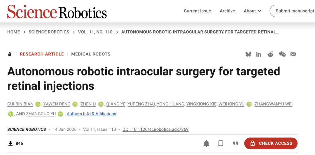 近日,中国科学院自动化研究所多模态人工智能系统全国重点实验室边桂彬研究员课题组成功研发一款自主显微眼科手术机器人系统,并验证了临床可行性。该系统在整个眼内空间可实现自主的视网膜下和血管内注射,显著提高了眼底注射的精确性、安全性和一致性,最大限度地减少医源性损伤,可辅助外科医生更加专注于手术设计和监督任务。相关成果以《Autonomous robotic intraocular surgery for targeted retinal injections》为题发表于《科学·机器人》(Science Robotics)。https://www.science.org/doi/10.1126/scirobotics.adx7359 视觉是人类感知世界、获取外部信息最主要的渠道。据世界卫生组织统计,全球视力受损或失明人数已超过22亿。由于眼睛软组织结构精细、操作空间狭小,传统眼科手术对医生的经验和稳定性要求极高,医生在眼内手术中的手动操作面临着巨大挑战。在眼科手术中,自主机器人手术系统通过更加智能、精准的操作控制,有望大幅提升手术安全水平,缩短外科医生学习曲线,为多种眼科疾病的治疗提供新的可能,惠及更多患者。 自主研发的自主显微眼科手术机器人系统,创新性地打造了涵盖术中三维空间感知、跨尺度精确定位及轨迹精准控制的核心算法模块: 在三维空间感知方面,团队提出多视角空间融合方法,成功攻克多模态眼内成像中存在的成像异质性与动态空间失准难题。通过构建术中可动态更新的全局三维地图,实现了对眼内区域的全方位感知。 精确定位模块方面,基于准则加权的多传感器数据融合方法,有效解决了不同传感器在检测范围、误差幅度及采样频率上的差异问题。凭借这一创新技术,机器人手术器械尖端能够在眼内区域完成精准的宏观-微观双重定位,保障了手术操作的定位精度。 轨迹控制模块方面,创新提出多约束目标优化方法,对机器人末端执行器的运动轨迹进行精准规划。同时,结合人监督下的力-位置-影像混合控制模式,在确保轨迹控制精度的同时,最大限度保障了手术过程的安全性,为眼科手术的顺利开展提供了可靠保障。 图1.显微眼科机器人进行自主视网膜手术示意 在眼球假体、离体猪眼球及活体动物眼球的视网膜下注射与血管注射实验验证中,该系统均实现了100%的注射成功率。平均定位误差较医生手动操作降低约79.87%,即使与医生操作机器人辅助手术相比,误差也减少约54.61%,展现出优越的精确性与安全性。 该研究成果为眼内手术的自主化开辟了全新的技术路径,不仅证明了自主机器人能够安全、精准地完成显微手术,更有望推动眼科手术治疗向智能化、精准化方向发展。该系统未来还有望应用于远程诊疗、应急救援甚至太空医疗等复杂场景,展现出广阔的应用前景。 图2. 显微眼科机器人主要研究人员 (从左至右依次为:付攀博士生、叶强助理研究员、边桂彬研究员、翟宇鹏博士生、李桢副研究员、邓雅文博士生) 文章来源:中国科学院自动化研究所 |