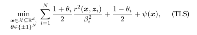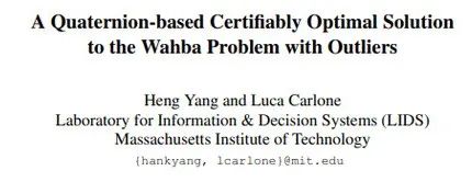 图注:杨珩被 ICCV 2019 接收的工作 论文地址:https://arxiv.org/pdf/1905.12536.pdf 对杨珩来说,ICCV 2019 的这篇工作有里程碑式的纪念意义:因为那篇文章是第一个能将有异常值(outliers)的机器人感知问题在多项式时间内(polynomial time)解到全局最优(global optimality)的工作。我们设计的半正定规划松弛(SDP relaxation)是extremely tight,那个算法几乎对所有问题都能得到全局最优,而且它解的原问题是一个带有二元变量(+1 和 -1,mixed integer)的非凸问题。这种问题是一个NP-hard问题。 Wahba 问题,又称为“旋转搜索”,旨在找到最佳旋转以在给定的对应关系下对齐两组向量观察,是许多计算机视觉和机器人应用中的基本研究(比如可以用作卫星的定位)。在 ICCV 2019 中,杨珩针对大量向量观测值为异常值(outliers)的情况,提出了第一个多项式时间可证明的最优方法来解决 Wahba 问题。 在这篇工作中,除了使用 TLS 成本来制定 Wahba 问题,他们还开发了凸半定规划(SDP)松弛来解决非凸问题。他们提出可认证算法 QUASAR (基于 QUAternion 的半定松弛法,用于鲁棒对齐),即使在面临大量噪声与异常值的情况下(比如多余95%的异常值),他们的松弛也很“紧”,算出可证明的全局最优解(即松弛是精确的),优于鲁棒的局部优化算法 RANSAC。 “非凸”转“凸”,是杨珩提出的算法能够在大部分输入数据中求得全局最优解的关键点。凭借这一主导思想以及后续的一系列工作,杨珩获得 ICRA 2020 的机器视觉最佳论文奖,还入围了 RSS 2021 最佳论文奖最终名单。 如前所述,TLS是一个非凸优化问题,基本框架如下: