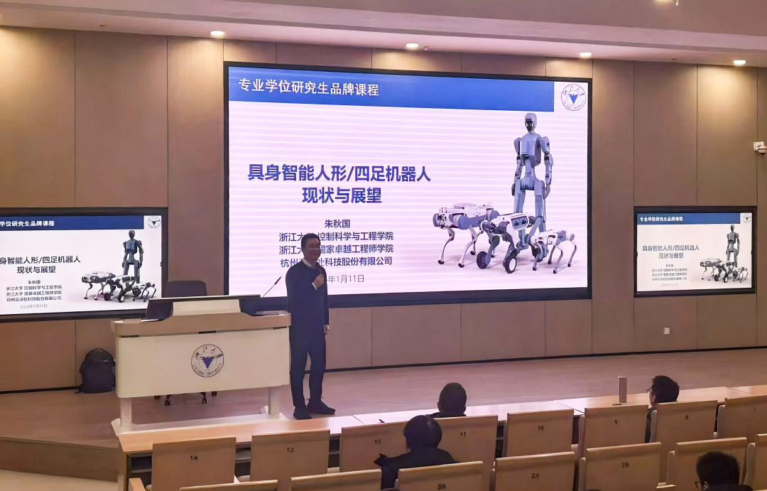 为深化专业学位研究生教育改革,推动校企协同育人,满足国家对高层次机器人与人工智能创新人才的需求,浙江大学机械工程学院持续开展专业学位硕士研究生校企专家同堂授课品牌课程《智能制造的重大工程案例》。1月11日,杭州云深处科技有限公司创始人兼CEO朱秋国应邀做客该课程,为我院专业学位硕士研究生带来题为《具身智能人形/四足机器人现状与展望》的精彩报告。 朱秋国,浙江大学机械工程学院院友、杭州云深处科技有限公司创始人,作为杭州科创“六小龙”核心企业掌舵人,他长期深耕足式机器人、具身智能及运动控制技术的研究与产业化,带领团队研发出国内知名的“绝影”系列四足机器人。作为行业领军人物,他推动四足机器人在电力巡检、应急救援等复杂工业场景规模化落地,助力云深处科技成为杭州“六小龙”中机器人领域的标杆力量,其本人多次斩获省部级科技进步奖项,更是产学研深度融合、赋能新质生产力发展的杰出代表。 朱老师从足式机器人的发展背景切入,深入浅出地阐述了机器人技术从实验室走向产业化的演进路径。他指出,随着人工智能与运动控制技术的飞速发展,足式机器人已具备在非结构化复杂环境中作业的能力,成为连接数字世界与物理世界的重要载体。他结合杭州云深处科技有限公司的创业历程,系统介绍了“绝影”系列机器人在核心算法、硬件设计及感知导航方面的技术突破,并强调,真正的技术创新必须经得起实际场景的考验,从电力巡检到应急搜救,每一项应用都体现了对产品可靠性与智能化的极致追求。 朱老师还围绕“卓越工程师”培养与人才成长的主题分享了独到见解,勉励在场机械学子既要仰望星空,紧跟具身智能等国际前沿技术,更要脚踏实地,夯实底层代码能力与工程实践基础。他表示,在快速迭代的科技浪潮中,保持好奇心与终身学习的能力是工程师职业生涯中的核心素养。 交流互动环节气氛热烈,同学们结合自身科研方向与职业规划踊跃提问。 针对同学们关注的“空地协同”技术前景,对于同学提出的“在电力巡检等高处场景中,无人机与机器狗如何实现更好的形态与信息交互”的问题,朱老师结合与从事无人机研究的徐超老师的“空地组合”实践,给出专业解答。无人机具备空间灵活性与高视野优势,适用快速覆盖,但受限于续航与互动能力;足式机器人则在续航时间、地面负载及交互操作方面更具优势则拥有更长的续航与地面负载互动能力。未来,“无人机+机器狗”的协同模式将实现优势互补,在复杂场景中构建全方位的立体巡检与作业体系。 围绕企业招聘与人才需求问题,作为杭州“六小龙”企业负责人,朱老师结合硬科技行业用人趋势给出建议。他区分了企业中Research(研究)与 Development(开发)的不同定位,强调机器人领域企业在招聘研发人员(R&D)时尤为看重代码编写的硬实力,同时指出除专业匹配度外,企业也看重候选人有自我驱动力、责任心和持续成长潜力等特质。他鼓励同学们在校期间夯实专业基础,强化解决实际问题的能力,以契合硬科技行业的核心需求。 本次报告不仅展示了足式机器人领域的前沿技术与工程实践,更通过真实案例与职场经验分享,拓展了学生的学术视野与职业认知。课程在热烈的掌声中圆满结束,为学院培养兼具创新精神与实战能力的卓越工程人才注入了新动能。 图:硕士研究生秦天 文:硕士研究生赵珩 文章来源:浙江大学机械工程学院 |