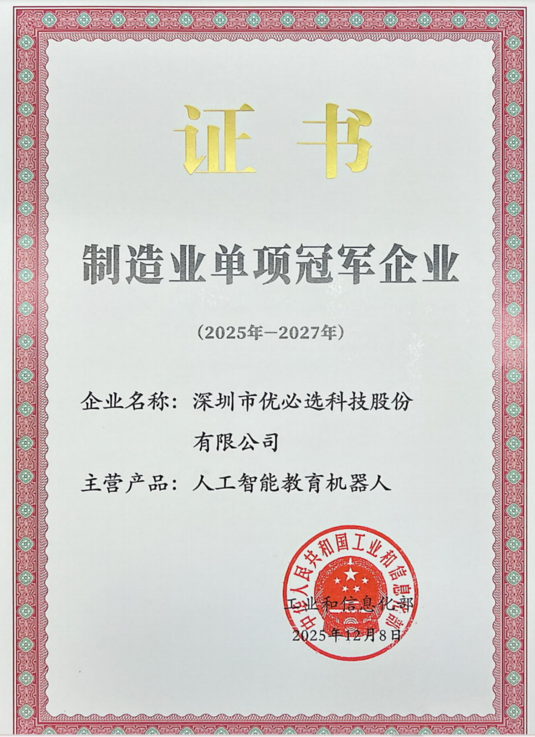 近日,优必选科技凭借“人工智能教育机器人”在全球范围的市场占有率优势、研发及制造领先性,顺利通过工业和信息化部审核,获得“国家级制造业单项冠军企业(2025-2027)”荣誉。这一制造业领域的顶级荣誉,代表了企业在特定细分市场中的全球领先地位,也是对公司在人工智能教育领域研发积累和技术创新能力的认可。 评选标准严格 优质企业认证 “国家级制造业单项冠军企业”名单根据最新的《制造业单项冠军企业认定管理办法》(简称《管理办法》)由企业向所在地市申报,之后省工信厅和工业和信息化部遴选确定。 根据《管理办法》规定,认定工作重点评估企业在专业发展、市场竞争、自主创新、经营管理等五个方面的表现。企业需深耕特定细分领域5年及以上,所申请产品的市场占有率达到全球前三位。产品生产技术或工艺国际先进,关键性能指标需达到国际领先水平。企业需拥有高水平研发机构,自主研发投入强度、自主知识产权和专利数量需要在行业中领先。严格的评选标准也是获得认证企业的实力证明。 目前,我国已将人工智能教育普及工作提升至国家战略层面。“人形机器人第一股”优必选科技凭借深厚的技术积累及积极的市场化探索,已深耕人工智能教育业务9年,倡导以丰富多样的智能机器人为学习载体,推动人工智能教育的普及,为社会培育适应AI时代的高质量人才。优必选教育提供包括人工智能教育机器人研发、生产、制造、产品运营维护、人工智能教育基地建设、人工智能课程开发支持、教师培训等各个环节在内的“人工智能教育全栈式解决方案”。 为AI教育而生 产教融合赋能未来课堂 优必选人工智能教育解决方案的服务对象涵盖中小学、职业院校、高校、研究机构。公司自主研发的教育机器人专为人工智能、具身智能教学而设计,包括UGOT系列(多拟态通用机器人)、ukit-AI系列(可拼搭编程机器人)、Yanshee(人形教育机器人)和全尺寸科研教育人形机器人天工行者系列等在内的多个产品类型。 多拟态人工智能教育机器人UGOT以模块化的设计,匹配强算力的主控,能够解决AI科创老师在教学过程中的各种需求。ukit-AI系列和Yanshee人形教育机器人等产品能够辅助编程课程直观展示,让科创课程多元有趣,培养学生创造力。作为机器人设计的中国样本,UGOT曾斩获了德国“iF设计奖”最高奖项金质奖和红点奖最高奖项“红点至尊奖”。 优必选教育机器人研发、制造和整体供应链实现了国产化,自主可控。在产品的运控技术方面,重点突破了大扭矩小尺寸的伺服舵机技术,机器人步态控制算法等领域的核心技术,打破了国外对机器人用驱动器技术的垄断。通过装配公司自研的高性能伺服驱动器,优必选降低了教育机器人的制造成本,为人工智能教育普及化提供重要支撑。 此次,优必选科技获得国家级“制造业单项冠军企业”荣誉,是对公司技术实力、人工智能教育市场地位与行业引领能力的高度认可。未来,优必选将持续深耕人工智能和具身智能教育的普及工作,培养适应智能时代发展的创新型、应用型技术人才,为国家的产业升级提供坚实的人才支撑。 |