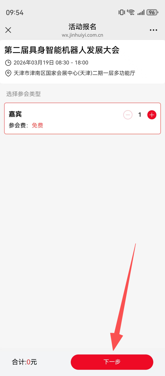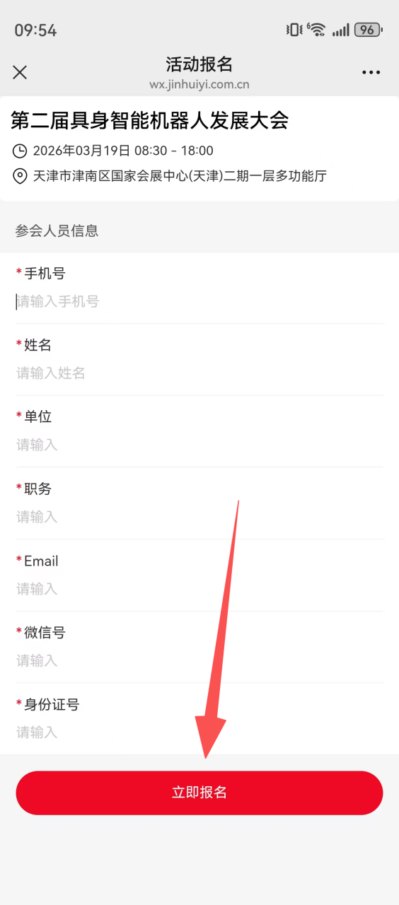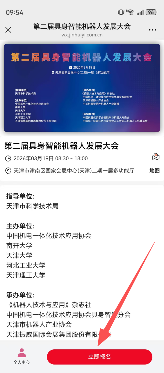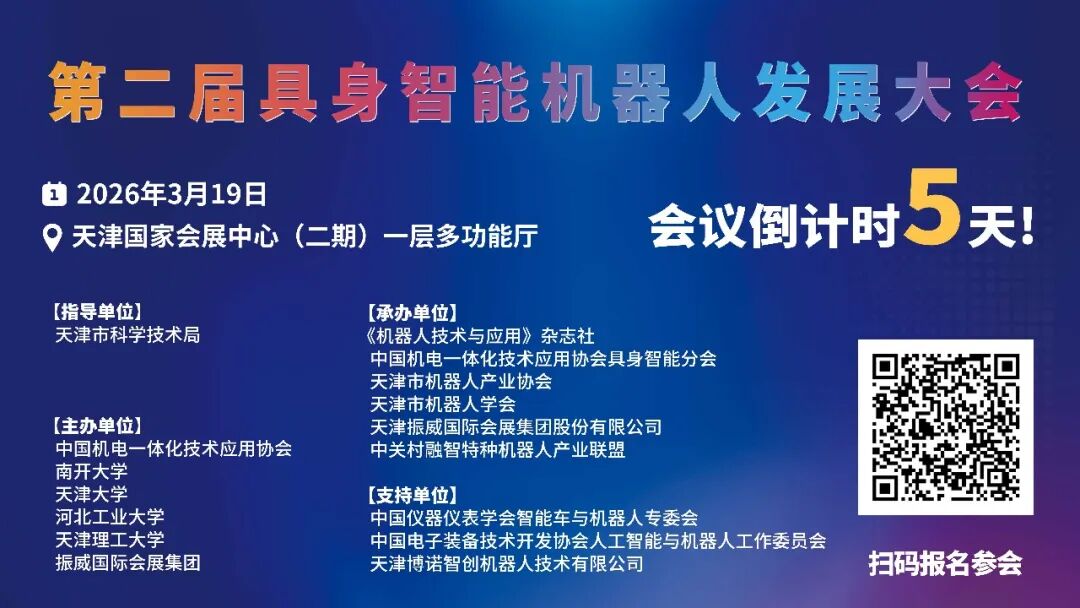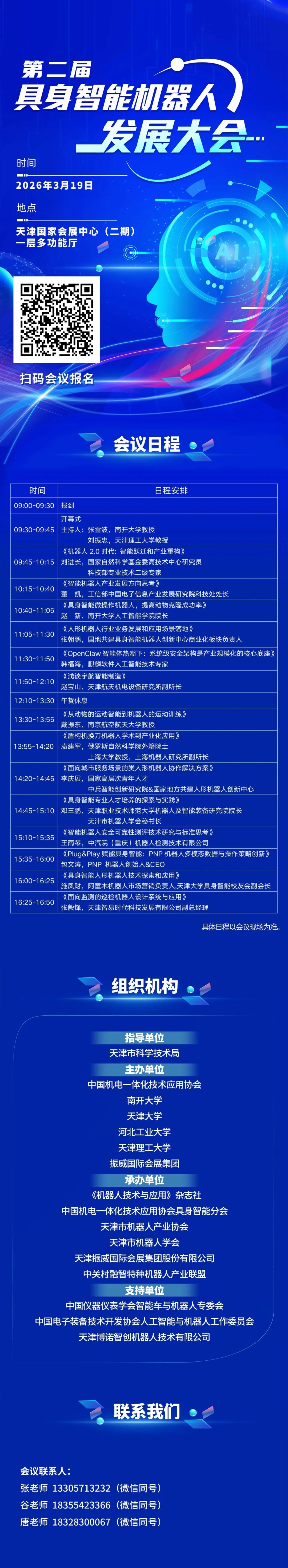 第二届具身智能机器人发展大会将于3月19日在天津国家会展中心(二期)一层多功能厅举行,会议以“场景驱动,量产突围:解锁具身智能发展新动能”为主题。 本次会议邀请到50余位院士、行业专家、头部企业家共同参与,会议展览同步进行,深入探讨具身智能、大模型和人形机器人的技术研发、场景应用以及产业链协同等方面的问题。 参会须知 · 参会采取实名认证入场,请务必提前报名,凭二维码在签到处签到并领取参会证,凭参会证参会; · 凭参会证可进天津工博会展馆观展; · 如需咨询具身智能机器人发展大会的其他信息,请与大会秘书组联系; 会务联系人: 张老师 13305713232(微信同号) 唐老师 18328300067(微信同号) 谷老师 18355423366(微信同号) 报名流程 1.扫描下方二维码免费报名 扫码报名参会 2. 选择“立刻报名” 3.选择“下一步” 4. 准确如实填写参会者信息后,选择“立即报名” 5. 报名成功后显示如下界面,截图保存以便现场签到! 温馨提示:报名成功后,您将陆续收到包含签到链接的短信。活动当天,凭短信内的链接二维码即可快速签到入场。 |
