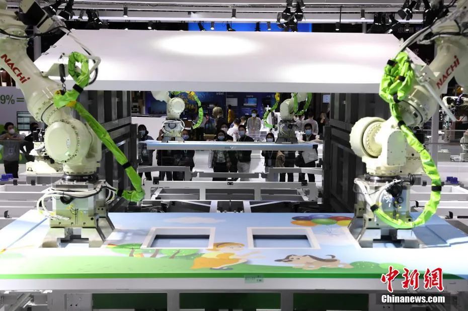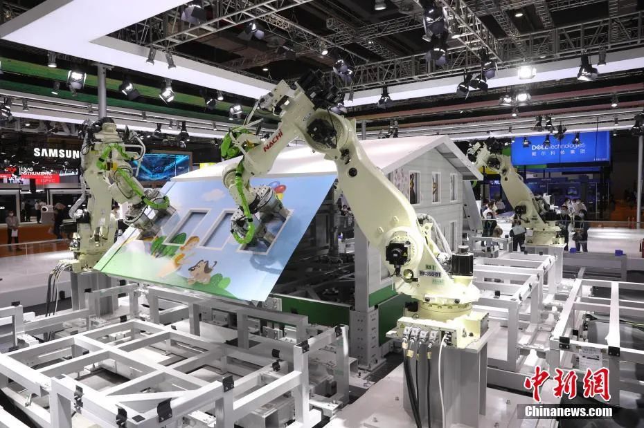 智能及高端装备展区那智不二越展台展示由大型机器人MC350协调动作,实现房屋自动搭建的建筑行业“绿色”生产方式。