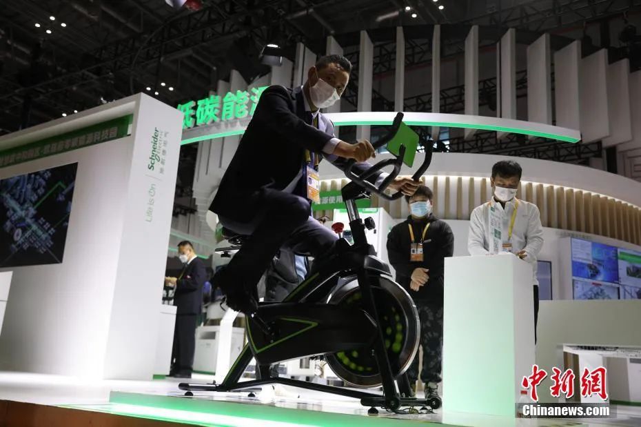 参会者在智能及高端装备展区施耐德展台体验骑行发电。 文章来源:中国新闻网 |