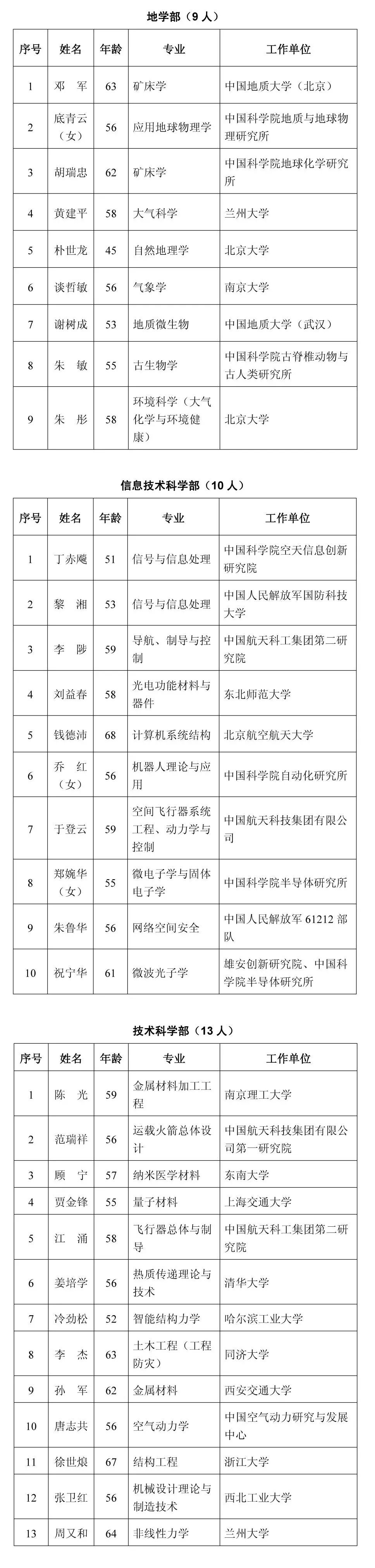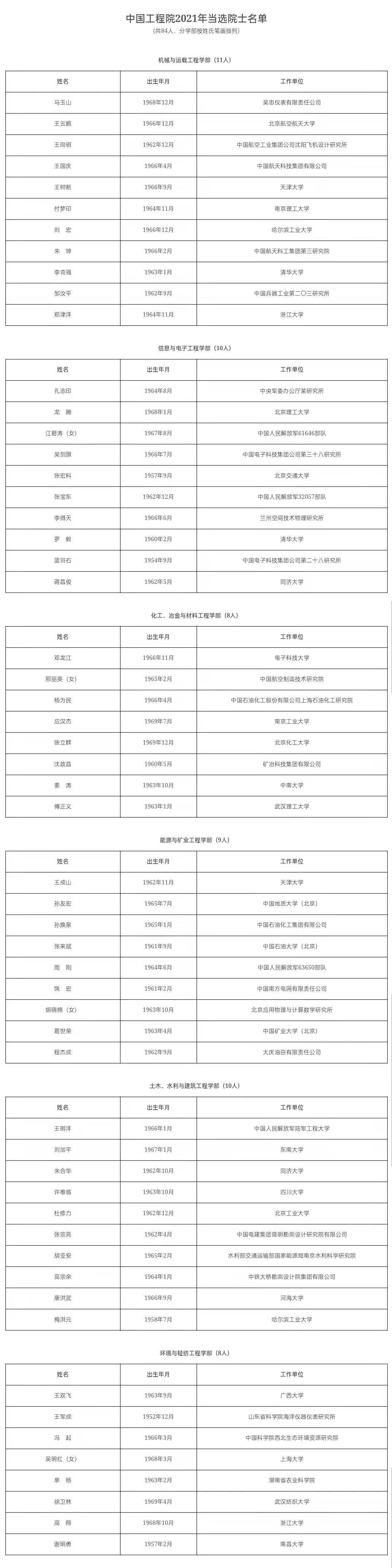 11月18日,2021年两院院士增选结果正式揭晓,共有149人当选。其中,中国科学院增选院士65人,中国工程院增选院士84人。 65人新当选为中国科学院院士平均年龄57.4岁 根据《中国科学院院士章程》《中国科学院院士增选工作实施细则》等规定,2021年共选举产生中国科学院院士65人,其中女性科学家5人。在新当选中国科学院院士中,数学物理学部12人,化学部11人,生命科学和医学学部10人,地学部9人,信息技术科学部10人,技术科学部13人。新当选院士平均年龄57.4岁,最小年龄45岁,最大年龄68岁,60岁(含)以下的占76.9%。院士队伍结构得到进一步优化,特别是通过特别推荐评审机制,国防和国家安全领域有5人当选,新兴和交叉学科领域有3人当选。 84人新当选为中国工程院院士平均年龄58岁 根据《中国工程院院士增选工作实施办法》等规定,中国工程院2021年院士增选共选出中国工程院院士84人,其中女性科学家6人。在新当选中国工程院院士中,机械与运载工程学部11人,信息与电子工程学部10人,化工、冶金与材料工程学部8人,能源与矿业工程学部9人,土木、水利与建筑工程学部10人,环境与轻纺工程学部8人,农业学部10人,医药卫生学部11人,工程管理学部7人。新当选院士平均年龄58岁,最小年龄51岁,最大年龄69岁,60岁(含)以下的占75%。一批长期奋战在国家重大工程、核心技术攻关、坚守在东北老工业基地和西部边远地区的杰出工程科技专家当选。