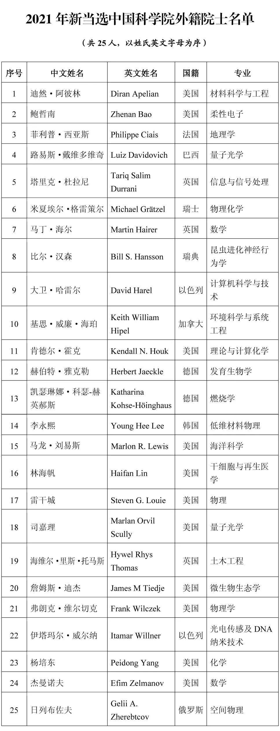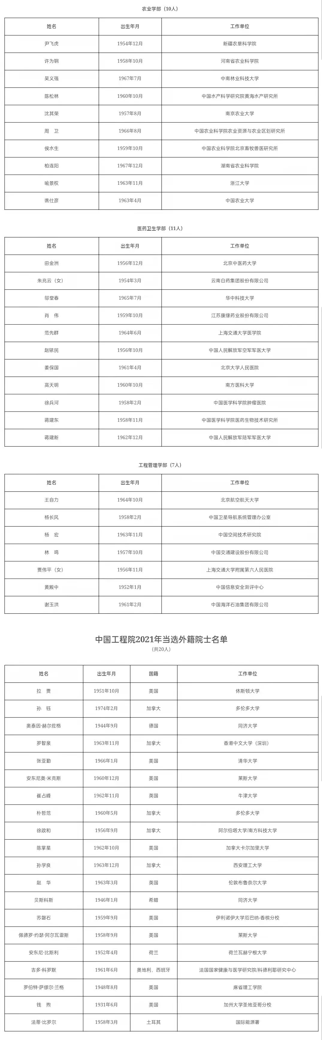 此外,2021年中国科学院新当选外籍院士25人,分别来自11个国家,韩国和瑞士首次有科学家当选中国科学院外籍院士;中国工程院新当选外籍院士20人。本次增选后,中国科学院院士总数为860人,外籍院士总数为129人;中国工程院院士总数为971人,外籍院士总数为111人。