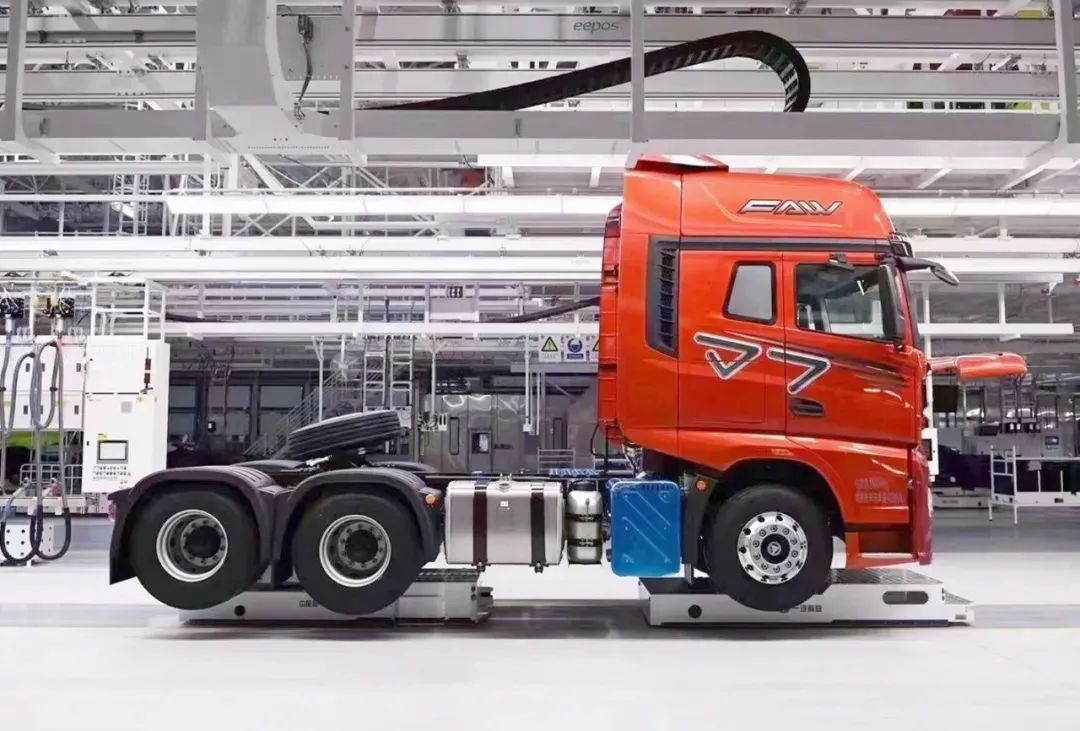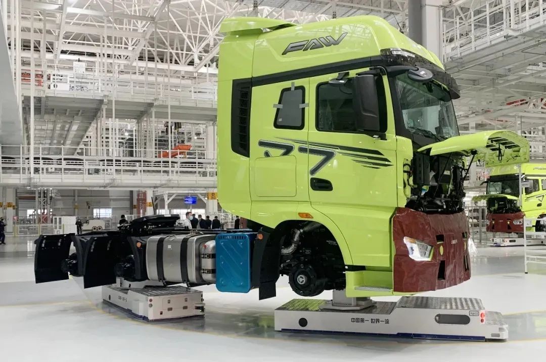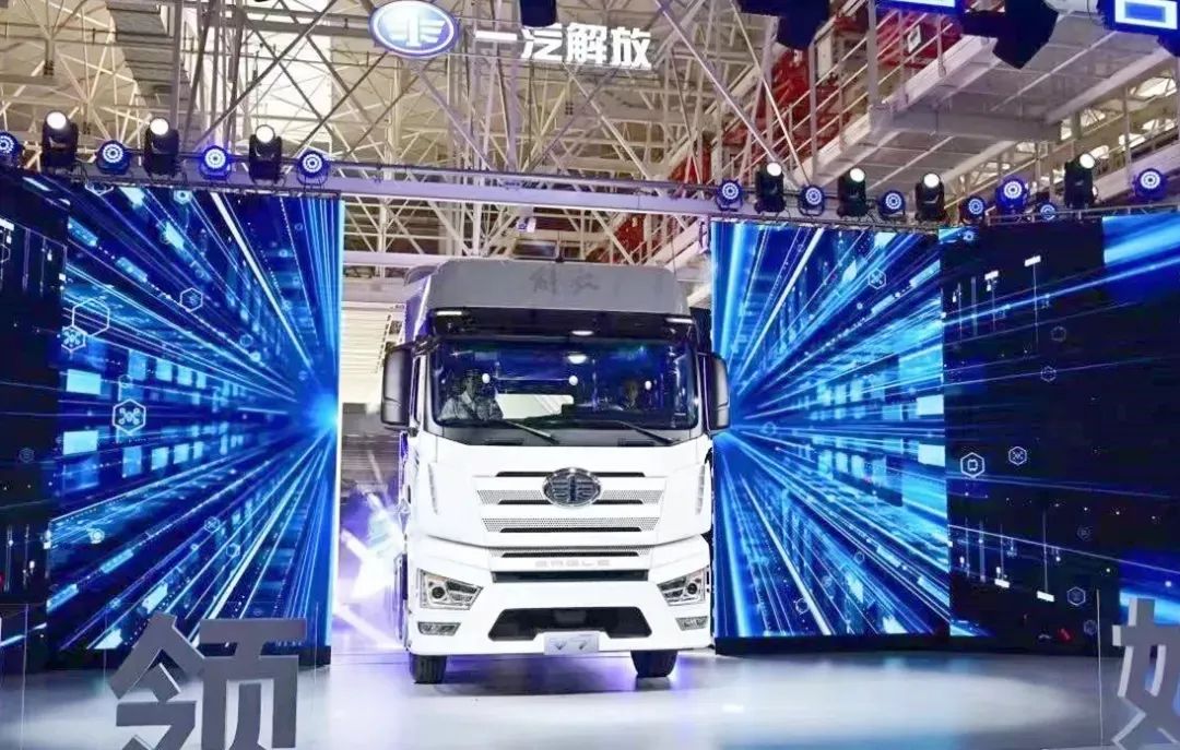 一汽解放J7重卡亮相智能工厂落成投产仪式 一汽解放J7重卡一经面世就屡获行业高度评价,代表了我国自主高端重卡研发、制造领域的全新高度。新松开创性地将移动机器人双车联动转弯技术在重载、超长物体运输环节投入应用,实现大体积、大重量的产品生产装配环节的柔性输送。