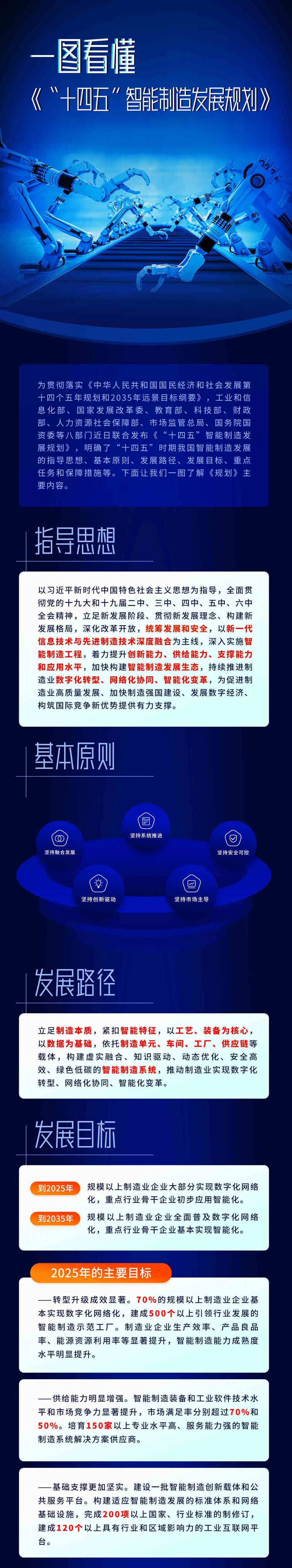 2021年12月28日,工业和信息化部等八部门今天联合印发了《“十四五”智能制造发展规划》。 《“十四五”智能制造发展规划》提出:“十四五”及未来相当长一段时期,推进智能制造,要立足制造本质,紧扣智能特征,以工艺、装备为核心,以数据为基础,依托制造单元、车间、工厂、供应链等载体,构建虚实融合、知识驱动、动态优化、安全高效、绿色低碳的智能制造系统,推动制造业实现数字化转型、网络化协同、智能化变革。 到2025年,规模以上制造业企业大部分实现数字化网络化,重点行业骨干企业初步应用智能化;到2035年,规模以上制造业企业全面普及数字化网络化,重点行业骨干企业基本实现智能化。其中,到2025年的具体目标为:一是转型升级成效显著,70%的规模以上制造业企业基本实现数字化网络化,建成500个以上引领行业发展的智能制造示范工厂。二是供给能力明显增强,智能制造装备和工业软件市场满足率分别超过70%和50%,培育150家以上专业水平高、服务能力强的系统解决方案供应商。三是基础支撑更加坚实,完成200项以上国家、行业标准的制修订,建成120个以上具有行业和区域影响力的工业互联网平台。 《规划》还部署了智能制造技术攻关行动、智能制造示范工厂建设行动、行业智能化改造升级行动、智能制造装备创新发展行动、工业软件突破提升行动、智能制造标准领航行动6个专项行动,以及强化统筹协调、加大财政金融支持、提升公共服务能力、深化开放合作4项保障措施。