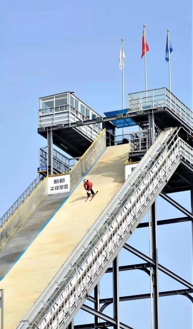 据介绍,“金针菇”旱雪毯表面采用了一种自带润滑特性的工程塑料,经改性后成型,表面光泽润滑,区别于普通塑料。另外,旱雪毯表面的圆球弧面,保证了旱雪表面与滑雪板的最小接触面积,增加了滑行时的润滑度。当滑雪者摔倒时,表面圆球也能最大程度保护滑雪者,减少受伤。 除此之外,旱雪毯的厚度和弹性,使其减震吸压、回弹力达到了非常出色的效果。当滑雪者立刃,对雪板加压时,滑雪者会感到很真实的回弹感觉,这是传统旱雪毯无法比拟的优势。旱雪毯也能很好地模拟滑雪的感觉,与真雪能达到90%以上的相似度。还能根据铺垫物的分布疏密程度,调节滑雪的难易度。 据悉,“金针菇”旱雪毯安装后使用寿命可达8年。且性能非常稳定,安装、拆卸以及后期维护都很方便。 除了旱雪毯,旱雪大跳台的落地气包是运动员们的另一个训练“秘密武器”。 2020年初,新都尖锋旱雪四季滑雪场针对冬奥会比赛项目训练,修建了专业滑雪道——旱雪大跳台。该滑雪道总高度43米,总长度112米,是国内最先建造的旱雪大跳台,也是目前中国最标准的旱雪训练大跳台之一。