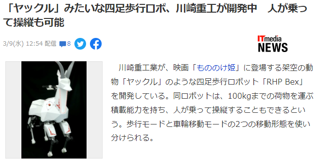 3月10日,据外媒报道,川崎重工近日推出一款名为「RHP Bex的四足机器人。「RHP Bex形似宫崎骏的惊世名作《幽灵公主》中的主角阿席达卡的坐骑,酷似山羊的雅酷儿。
