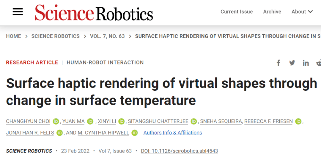 图片来源:Science Robotics 相关研究成果发表在Science Robotics期刊,论文以《通过表面温度的变化对虚拟形状进行表面触觉渲染》(Surface haptic rendering of virtual shapes through change in surface temperature)为题,目前就职于香港理工大学机械工程学系的助理教授马源为共同第一作者及通讯作者,德克萨斯 A&M 大学机械工程系Candidate崔昌铉(Chang Hyun Choi)博士担任共同第一作者,辛西娅·希普威尔(M. Cynthia Hipwell)教授担任通讯作者。 据悉,现有的摩擦力调控表面触觉技术主要有两类,分别为超声振动表面产生的摩擦力减小,以及电粘滞效应产生的摩擦力增大。 但这两种技术都存在一定的局限性。超声振动表面触觉技术需要振动整块或者大部分屏幕,因此耗电量较大,且不适于制作在大块屏幕上;电粘滞摩擦力调控技术需要在屏幕与手指之间建立强静电场,在一定程度上与触摸屏幕的触觉输入系统相互制约。这两种技术通常都需要 100V以上的电压进行驱动。 与这两种技术相比,基于表面温度的摩擦力调控手段显然在驱动电压、摩擦力调控效果等方面具有较为明显的优势。 而且值得注意的是,“新技术可以和前两者进行融合,进而拓宽表面触觉技术的能力范围,使更复杂的虚拟形貌渲染成为可能。”马源表示。 基于此项目所研究的技术,或可在未来给元宇宙带来更好的虚拟触觉渲染效果,使人们能够在触屏表面触摸到本不存在的按钮、指针、布料等虚拟物品。 1. Choi C, Ma Y, Li X, et al. Surface haptic rendering of virtual shapes through change in surface temperature[J]. Science Robotics, 2022, 7(63): eabl4543. 文章来源:DeepTech深科技 |