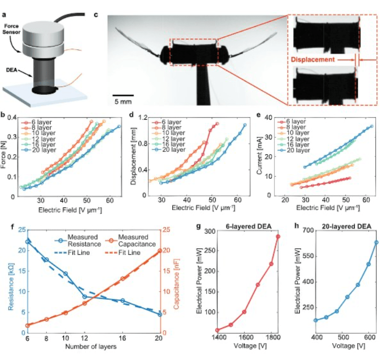 图片来源:Advanced Materials 据了解,集成该DEA的空中机器人在现有亚克级(sub-gram)空中机器人中性能最好、飞行时间最长,其悬停时间达到20s,位置和姿态误差分别小于2.5cm和2°,并实现了超过 200万次驱动循环的长使用寿命。 而且,该机器人在升力重量比(lift-to-weight ratio)方面也有所提升,从之前的2:1提升到了 3.7:1,是目前同尺寸下能达到的最好性能。 论文第一作者任智健称,之所以能达到这样的突破,归功于进一步降低了DEA每一层弹性聚合物(Elastomer)的厚度。 此外,该团队针对DEA驱动电压较高的问题做出了努力。此前DEA需要达到接近2000V的工作电压才能使机器人完成起飞,而他们最新研制的DEA只需要大约500V的工作电压。 研究人员表示,从材料角度出发,降低电压就是要在减小每层弹性聚合物厚度的同时,增加相应的层数。虽然思路很容易被想到,但具体操作起来就会有各种各样的问题。 比如,层数增加会使得烘烤聚合物的时间增长,驱动器的整体制作时间也成倍增长,不利于进一步减小厚度;而且,随着厚度的减小,弹性聚合物中的气泡很容易在通电测试的过程中被击穿,从而导致驱动器整体性能的下降。