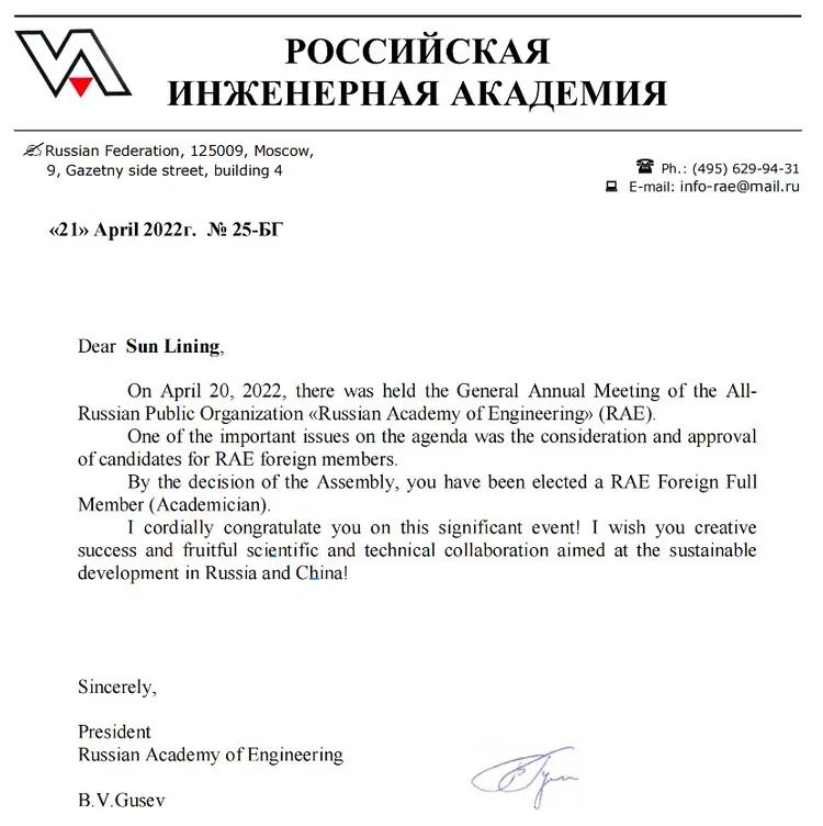 在4月20日的俄罗斯工程院(Russian Academy of Engineering,RAE)院士年会上,陈湘生、孙立宁、吴建平等25位华人专家当选俄罗斯工程院外籍院士。其中,有多位高校学者入选,这也是历年来华人专家当选最多的一次。 俄罗斯工程院成立于1990年,是俄罗斯三大跨行业科学机构之一,其创始单位有俄罗斯科学院、俄罗斯科工部、国防部、航天航空署等部门,首任院长是俄罗斯著名科学家、诺贝尔奖得主、俄罗斯科学院院士普罗霍夫。 俄罗斯工程院长B.V.Gusev院士随后向当选院士发来贺信,并希望他们为中俄两国的持续发展开展创造性和富有成效的科学和技术合作。 俄罗斯工程院高度评价苏州大学孙立宁教授为推动全球机器人领域创新发展所做出的贡献,希望他未来在推动中俄两国机器人相关领域科技创新与合作方面取得更多重要成果。