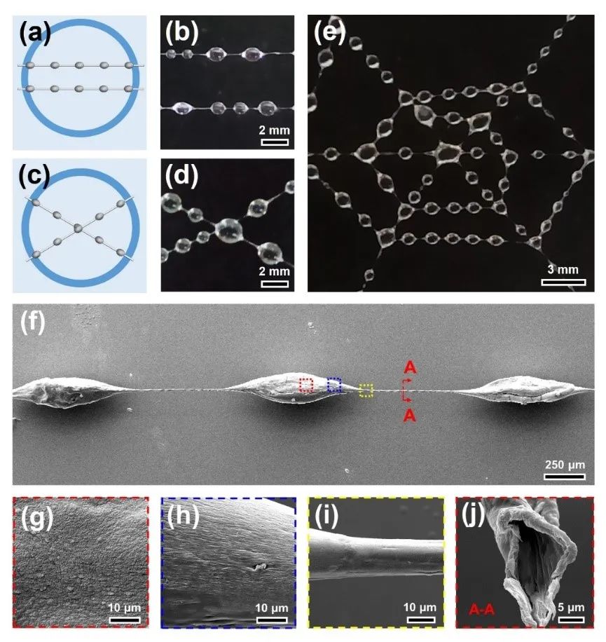 图1 蜘蛛丝网上布满水滴 图片来源:网络 受天然蜘蛛丝集水行为的启发,孟涛教授等设计并制造了一种具有高效集水性能的中空纺锤节微纤维(图2)。这种形貌可控,具有连续中空通道的周期性纺锤节微纤维是基于微流控多相层流方法,利用双水相(ATPS)的分区特性所制备的。相比于实心纺锤节微纤维,中空微纤维展现出更加优异的液滴悬挂能力、定向输送、增长速度以及集水效率。由于中空通道的存在,延长了液滴与纤维间的三相接触线长度,增强了液滴受到的毛细作用力。液滴悬挂在中空纺锤节微纤维时,中空通道内的液柱形成毛细桥,液柱两端半月板状凹陷为悬挂的液滴提供了额外的毛细作用力,从而提高了纤维悬挂液滴的能力。