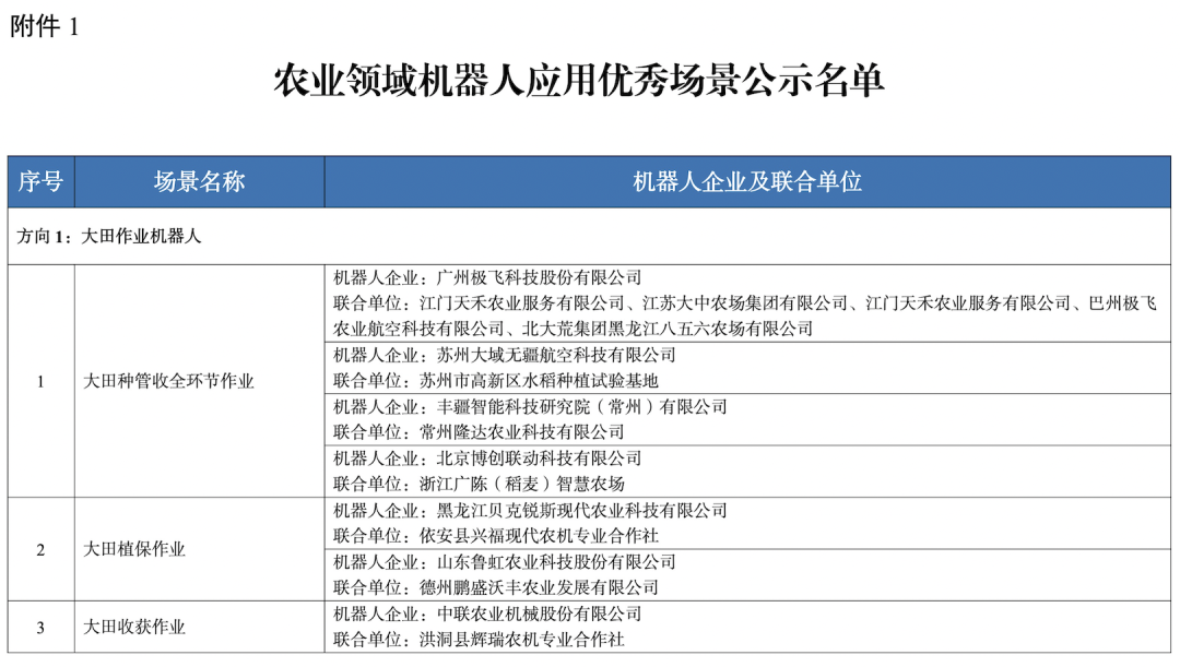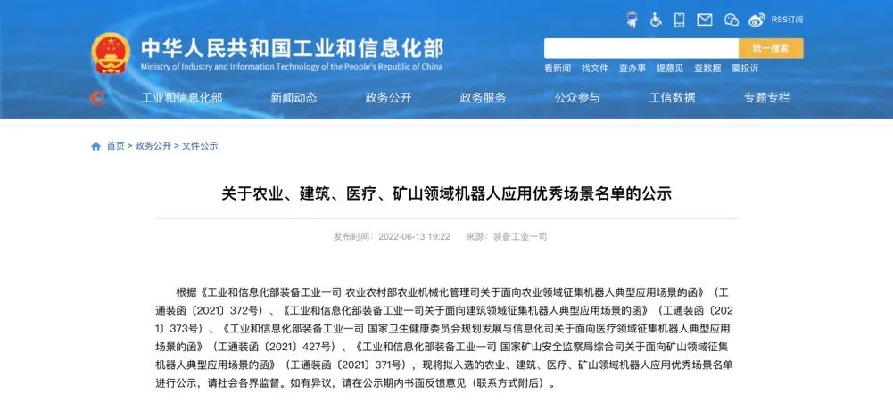 6月13日,工业和信息化部装备工业一司、农业农村部农业机械化管理司、国家卫生健康委员会规划发展与信息化司、国家矿山安全监察局综合司等四部门联合发布《关于农业、建筑、医疗、矿山领域机器人应用优秀场景名单的公示》。
