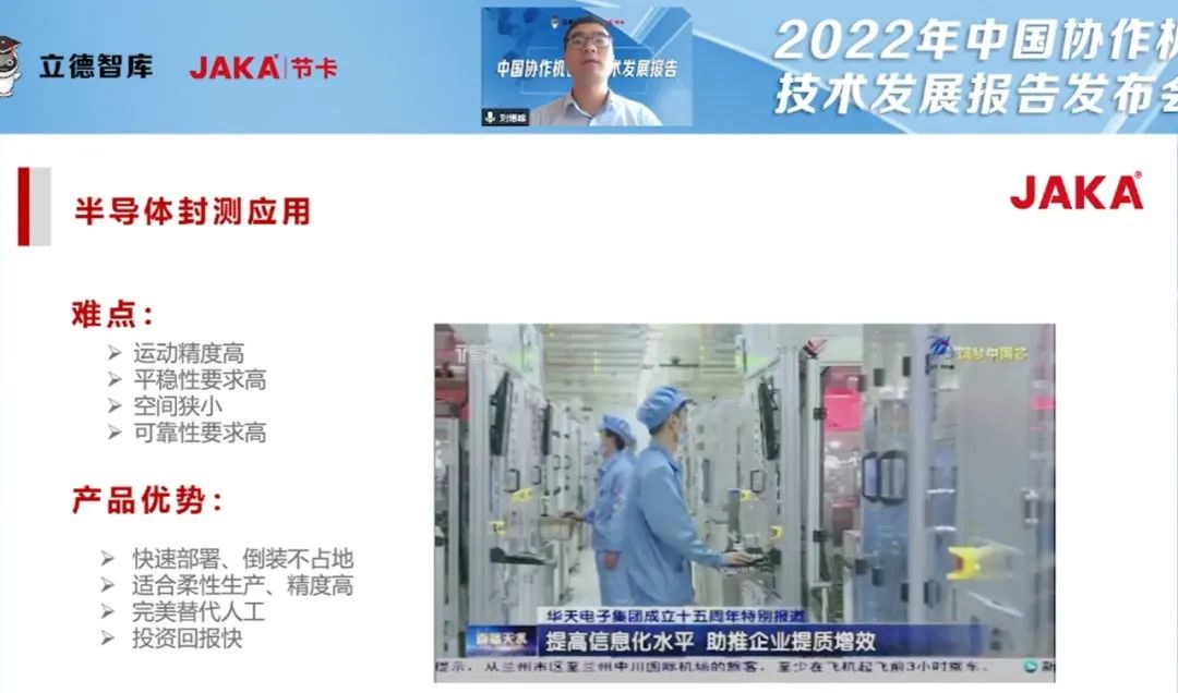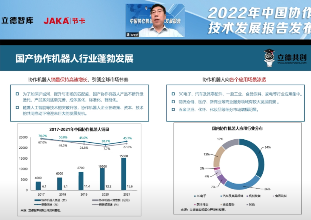 随着制造业的转型升级,许多复杂生产工作需要人机协作来共同完成,而传统工业机器人因体形大、安全性和灵活性较低等问题,难以满足市场需要。协作机器人凭借安全、灵活、易用等诸多优势,可以弥补传统工业机器人应用范围的局限性,在降低生产成本的同时提高生产效率和质量,成为未来智能制造发展的关键。 基于此,机器人行业高端智库——立德智库携手全球柔性智能机器人领跑者——JAKA节卡机器人,联合发布了《2022年中国协作机器人技术发展报告》,并于2022年6月22日下午14:00-16:00开展线上发布会。 来自上海交通大学、北京理工大学、上海机器人产业技术研究院、立德机器人研究院及节卡机器人的多位行业专家云出席发布会现场,共同探讨了协作机器人行业的发展情况,对协作机器人行业的过去、当下与未来进行了总结和预估。