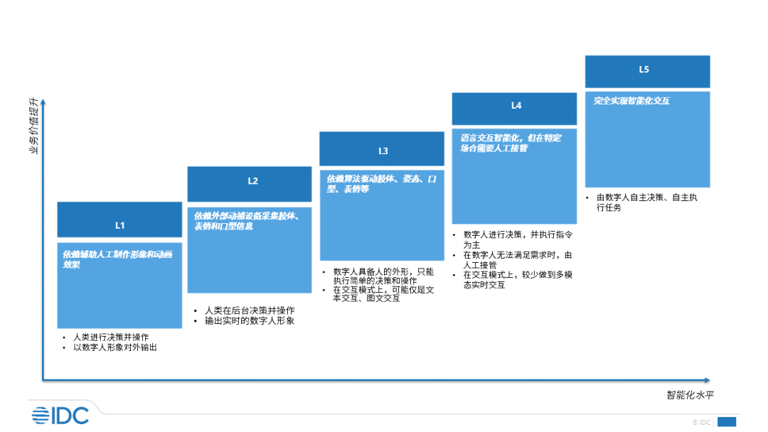 据IDC介绍,当下市面上数字人分类繁多,有泛娱乐型数字人/企业级服务数字人,有图文交互/声音交互/文字交互/多模态交互数字人,有真人替代型/身份型虚拟人,有真人驱动型/计算驱动型数字人。在这些分类中,并不是所有的数字人都是基于AI技术驱动。 因此,IDC在本次研究中将数字人定义为:采用人工智能技术驱动生成的数字化的虚拟人物—具备人的外观、感知互动能力以及表达能力。