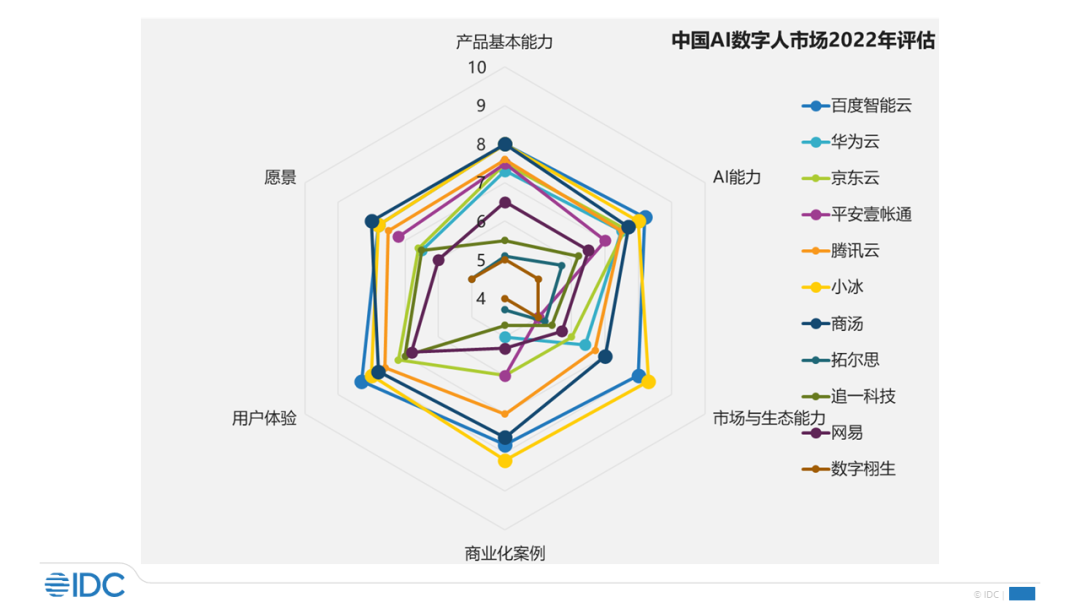 IDC认为,由于平台层端到端数字人生产厂商的出现,以及对于纯AI驱动的数字人的趋势,在企业级服务数字人市场,一定程度上缩短了产业链,诸如动捕、渲染、形象库等环节长远看来可能被纯AI技术取代。 根据报告,当前AI数字人整体上还处于起步阶段,距离市场成熟还有较长的距离,市场参与者大多为差异化竞争,分别在已有客户群体的领域依托自身技术优势进行深耕。综合厂商的产品基本功能、AI能力、市场及生态能力、商业化能力、用户体验以及未来发展愿景,可将AI数字人技术提供商市场格局简单的分为2-3个梯队,第一梯队以百度智能云、商汤、小冰公司为主,每家公司各有差异化优势。