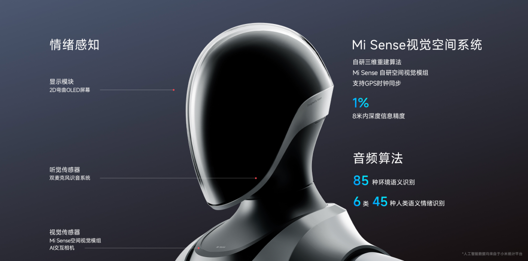 机器人的运动性能与各关节电机性能息息相关,而人形机器人对于电机的要求则更为苛刻,需要在尽可能小体积的前提下,爆发出更强劲的动能,以CyberOne上肢关节电机为例,小米自研了一枚重量仅为500g,额定输出扭矩高达30n·m的高效电机,保证上肢灵活性。CyberOne髋关节主要电机瞬时峰值扭矩可达300n·m,配合自研的人形双足控制算法,行走姿态更加平稳。其他方面,CyberOne支持单手握持1.5KG重物、反向拖动上肢复现运动等功能。总体而言CyberOne是一个小脑发达、运动能力超强的人形机器人。 和人一样,视觉是人形仿生机器人感知环境的重要途径。CyberOne搭载自研Mi-Sense深度视觉模组,结合AI交互算法,使其不仅拥有完整的三维空间感知能力,更能够实现人物身份识别、手势识别、表情识别,CyberOne真正做到了不仅看得到也能看得懂。CyberOne在与外界沟通交流方面,搭载了自研MiAI环境语意识别引擎和MiAI语音情绪识别引擎,能够实现85中环境音识别和6大类45种人类情绪识别,CyberOne能够陪你一起开心,也能够像个老朋友一样在你失落时给你一个拥抱。以上所有的能力均集成在CyberOne的大脑中,并且配合OLED显示模组,进行交互信息实时显示。 探索不止,让机器人走进人们的生活 机器人被誉为“制造业皇冠顶端的明珠”,而人形仿生机器人则是机器人领域公认的终极目标。相比于以机械能力见长的工业机器人,人形仿生机器人的技术难点在于尽可能模拟人在各类场景下“感知-认知-决策-执行”的过程。在对仿生人形机器人的研究过程中,产生的大量新技术能够更好的服务于人。 CyberOne的研发就是小米打造一个“连接人与万物”科技生态的探索过程。从智能手机到可穿戴设备、智能家居,再到智能制造、智能电动汽车以及仿生机器人,小米正在构建不断延展的科技场景,围绕人的生活和工作,更好为人服务,更紧密连接人和万物,形成不断进化的小米科技生态。 雷军表示,在智能机器人领域,人形仿生机器人的技术集成度最高、难度也最大,小米还处于刚刚起步的第一阶段,CyberOne每天都在学习新的技能,“我们相信,未来智能机器人一定会走进人们的生活”。