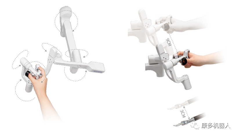 康多腹腔内窥镜机器人手术系统具有七自由度主操作手,真实映射人体手部位置和姿态。主、从操作的动作幅度可以比例调节,术者手部颤抖可被智能识别并滤除,确保手术操作更精准、更稳定。