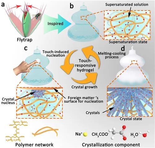 响应型高分子水凝胶能在外界的刺激下发生形态的转变,是一类重要的智能材料,在药物控释、光学器件、智能表面、柔性传感与驱动等领域都展现出了巨大的应用潜力。自然界中的生物体为智能材料的设计提供了丰富的灵感,如捕蝇草对于飞虫的触碰刺激可以快速形成电信号响应,从而驱动捕虫夹的闭合。中国科学院宁波材料技术与工程研究所智能高分子材料团队陈涛研究员受捕蝇草对飞虫的触碰刺激响应启发,该团队利用过饱和盐溶液的亚稳定性,开发了一种对触碰刺激具有多功能响应的新型智能高分子水凝胶,探索了其在智能软体驱动器上的驱动感知一体化应用。该工作通过在传统水凝胶中引入过饱和的盐溶液,制备了具有过饱和结晶相变行为的亚稳态智能高分子水凝胶材料。过饱和盐溶液的结晶过程伴随着明显的放热现象,因此除了触碰刺激-结晶响应外,该智能水凝胶同时具有触碰刺激-放热响应和触碰刺激-电信号响应行为。利用这种触碰刺激-放热响应性质,该工作仿造捕蝇草的“触碰刺激-电信号-驱动信号”的级联响应机制成功设计了一种基于“触碰刺激-热信号-驱动信号”的级联响应模式,最终实现智能高分子水凝胶软驱动器的触碰刺激-驱动响应。此外,智能高分子水凝胶的触碰刺激-电信号响应行为赋予了该智能软驱动器额外的触碰感知功能,实现了该智能软驱动器的感知驱动一体化功能集成,为下一代智能软体机器人的研究提供了新的思路。该工作以题为“Touch-Responsive Hydrogel for Biomimetic Flytrap-Like Soft Actuator”发表在Nano-Micro Letters, 2022, 14, 182上。