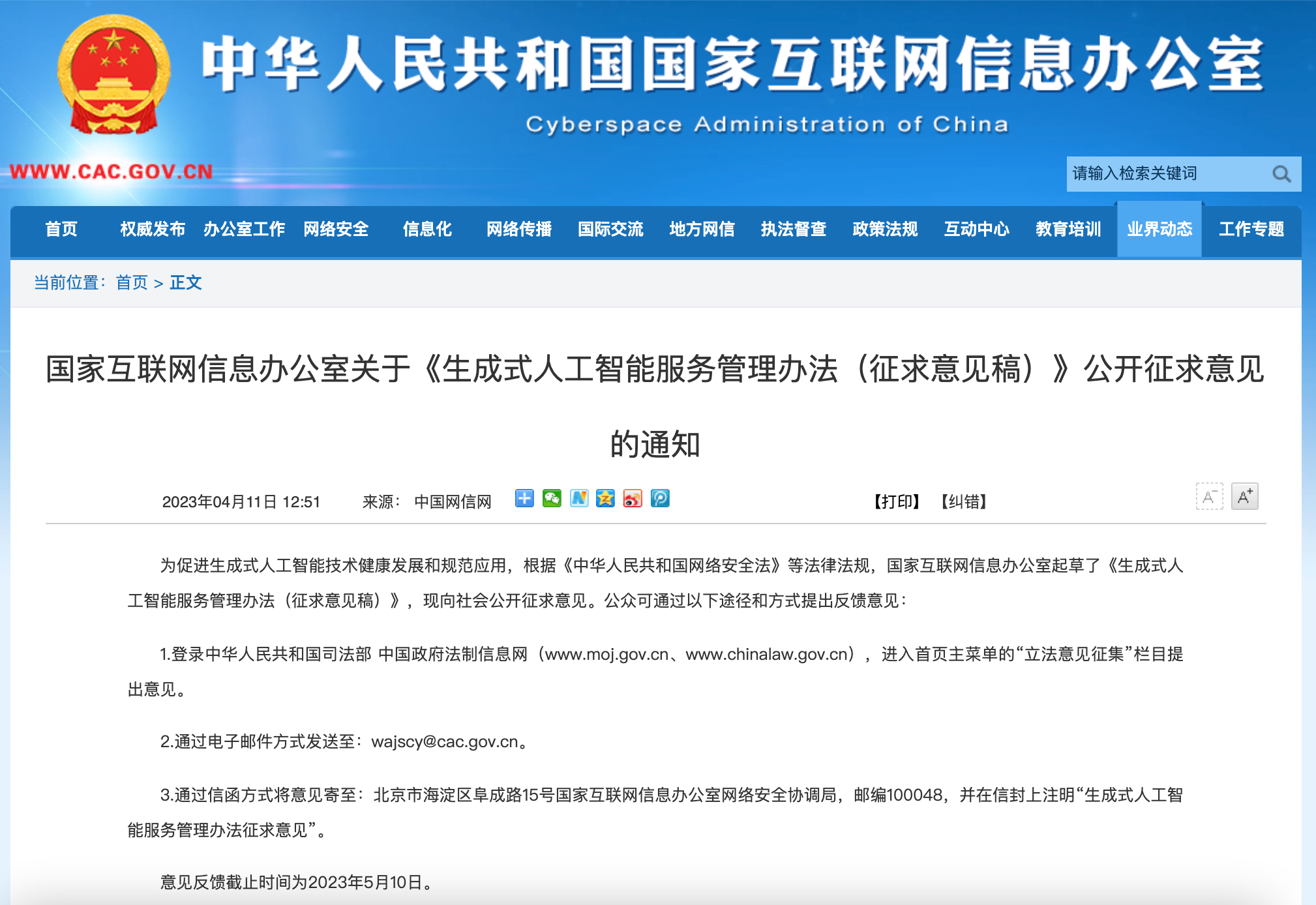 国家网信办发布《生成式人工智能服务管理办法(征求意见稿)》,首个国家AIGC监管文件出台!