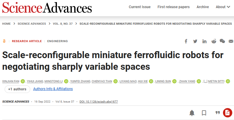近日,苏州大学机电工程学院孙立宁教授、杨湛教授课题组,哈尔滨工业大学谢晖教授课题组以及德国马克斯普朗克智能系统研究所的Metin Sitti教授课题组,联合研制出能自由穿梭在极端变化环境中的尺度可调控磁液滴机器人SMFR(Scale-reconfigurable miniature ferrofluidic robots)。