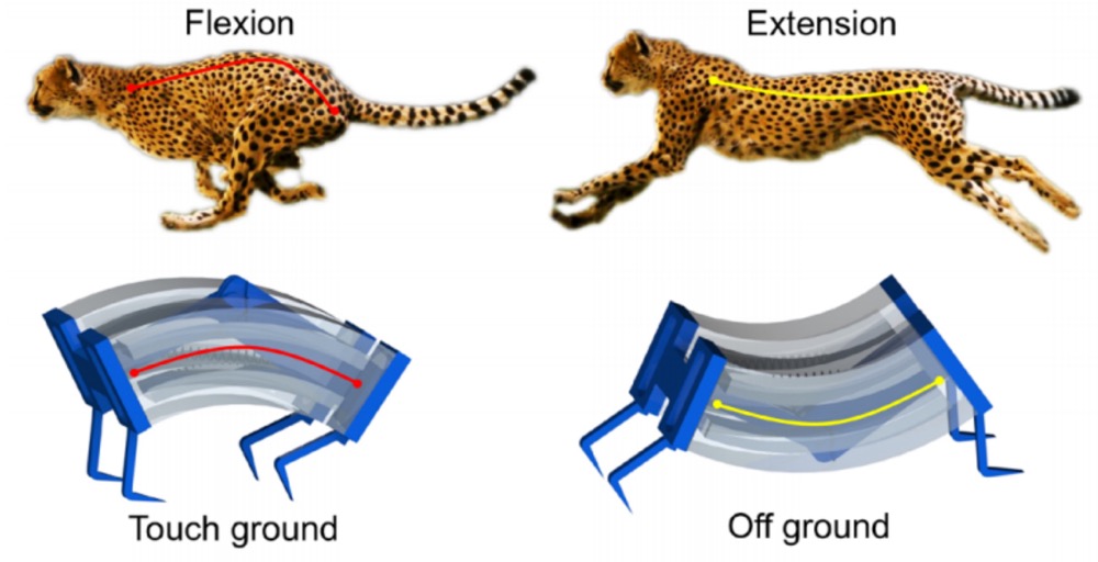 美国北卡罗来纳州立大学研究团队参考猎豹的生物力学结构设计了一种新型柔性机器人,该机器人在固体表面或者水下比先前的柔性机器人移动得更快。