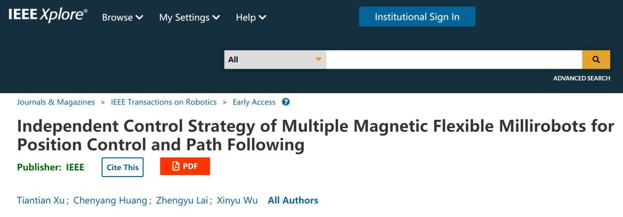 近日,中国科学院深圳先进技术研究院集成所智能仿生中心团队在微型机器人研究中取得进展,针对相同磁场下多个磁驱动软体微型机器人接收相同磁场而难以独立控制的问题,团队提出一种完全解耦的多磁驱动软体微型机器人独立控制策略,首次实现4个磁性软体微型机器人的独立位置控制和3个磁性软体微型机器人的独立路径跟随控制。相关成果发表在机器人领域期刊IEEE Transactions on Robotics上。