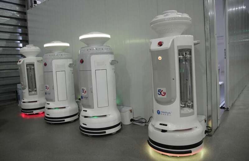 上海新国际博览中心方舱医院内,一批服务机器人、消毒机器人正与疫情防控工作人员并肩作战。