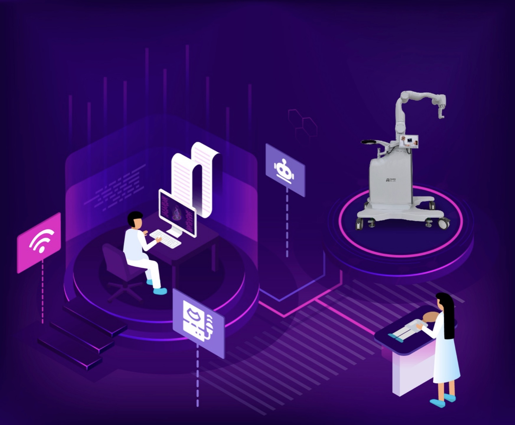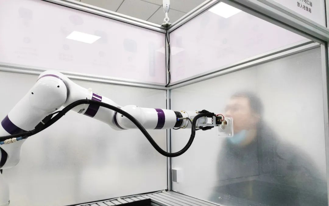为保护采样人员、节省人力,清华大学现代机构学与机器人化装备实验室与烟台清科嘉机器人联合研究院有限公司联合研发了咽拭子采样机器人,面向大规模全员核酸检测中的10合1、20合1等混采检测,替代医护人员完成咽拭子采样、样品保存液回收、病毒消杀等功能,采样效率高达42秒/人次,采样有效率100%,为科学有效应对新冠肺炎疫情传播风险提供有力保障。